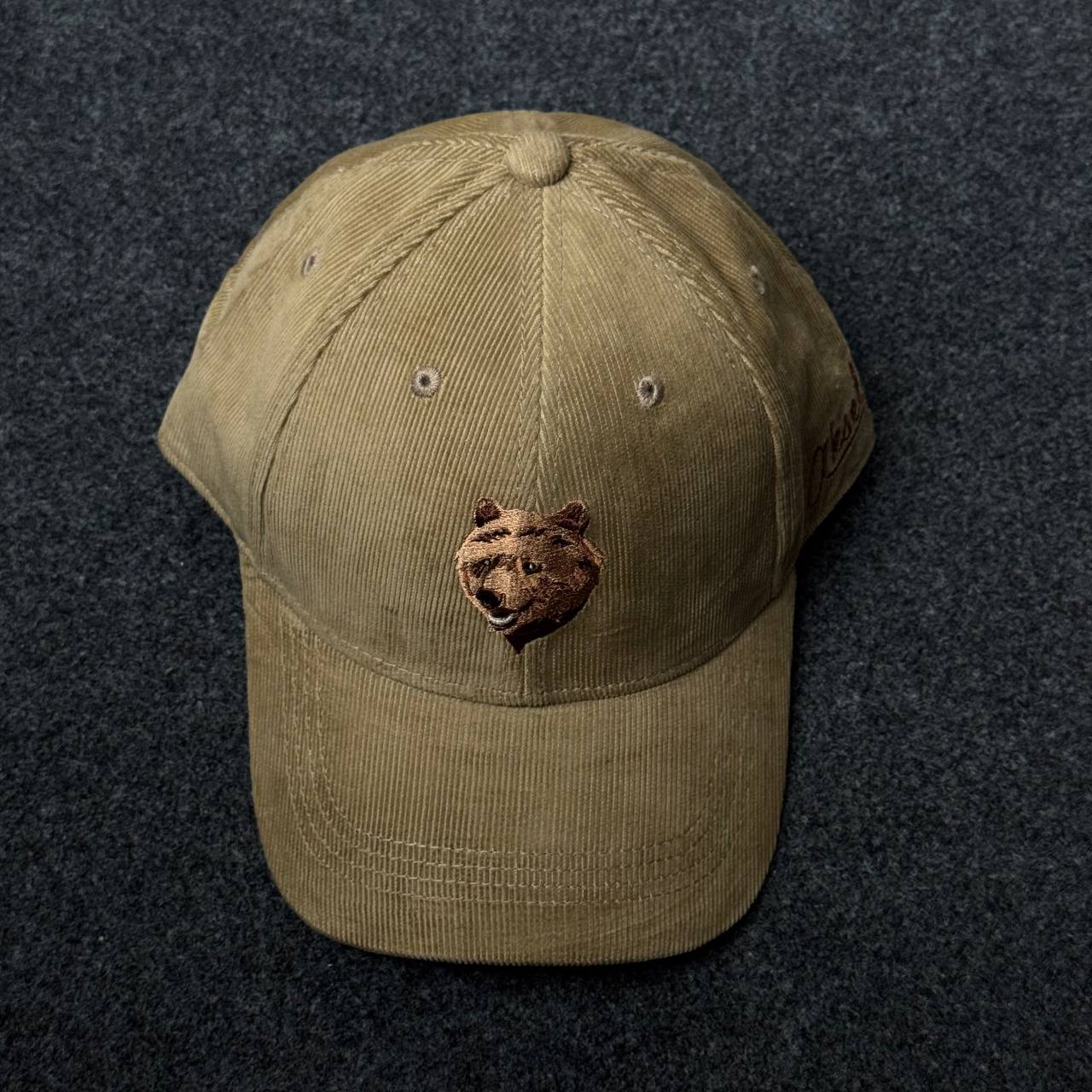 Channel woodland vibes with this khaki corduroy baseball cap, finished with a beautifully embroidered bear head on the front. The soft corduroy texture and earthy tones give it a relaxed, nature-inspired feel, while the "Akse..." script on the side adds a touch of branding uniqueness.