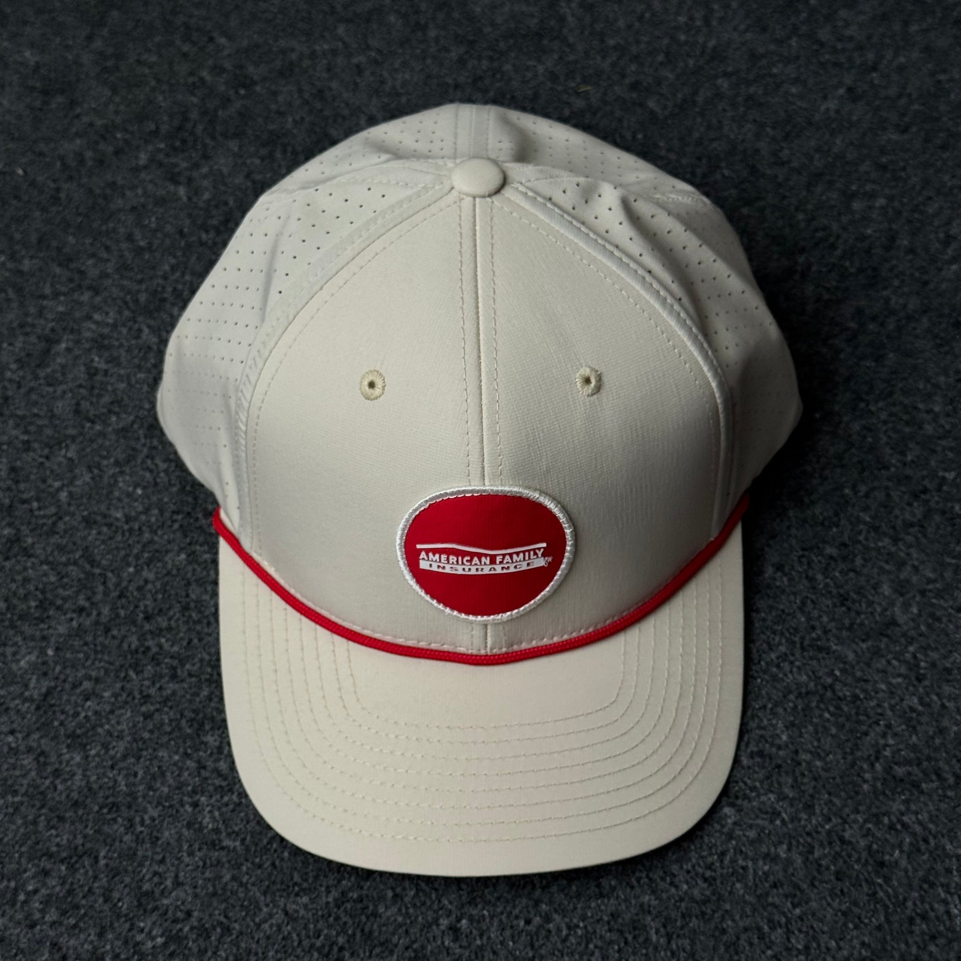 The American Family Insurance "Performance Circle" Cap is a sleek, technical piece that blends corporate identity with high-performance sportswear aesthetics. This design utilizes a clean, off-white palette and modern structural elements to create a sophisticated alternative to standard promotional headwear.