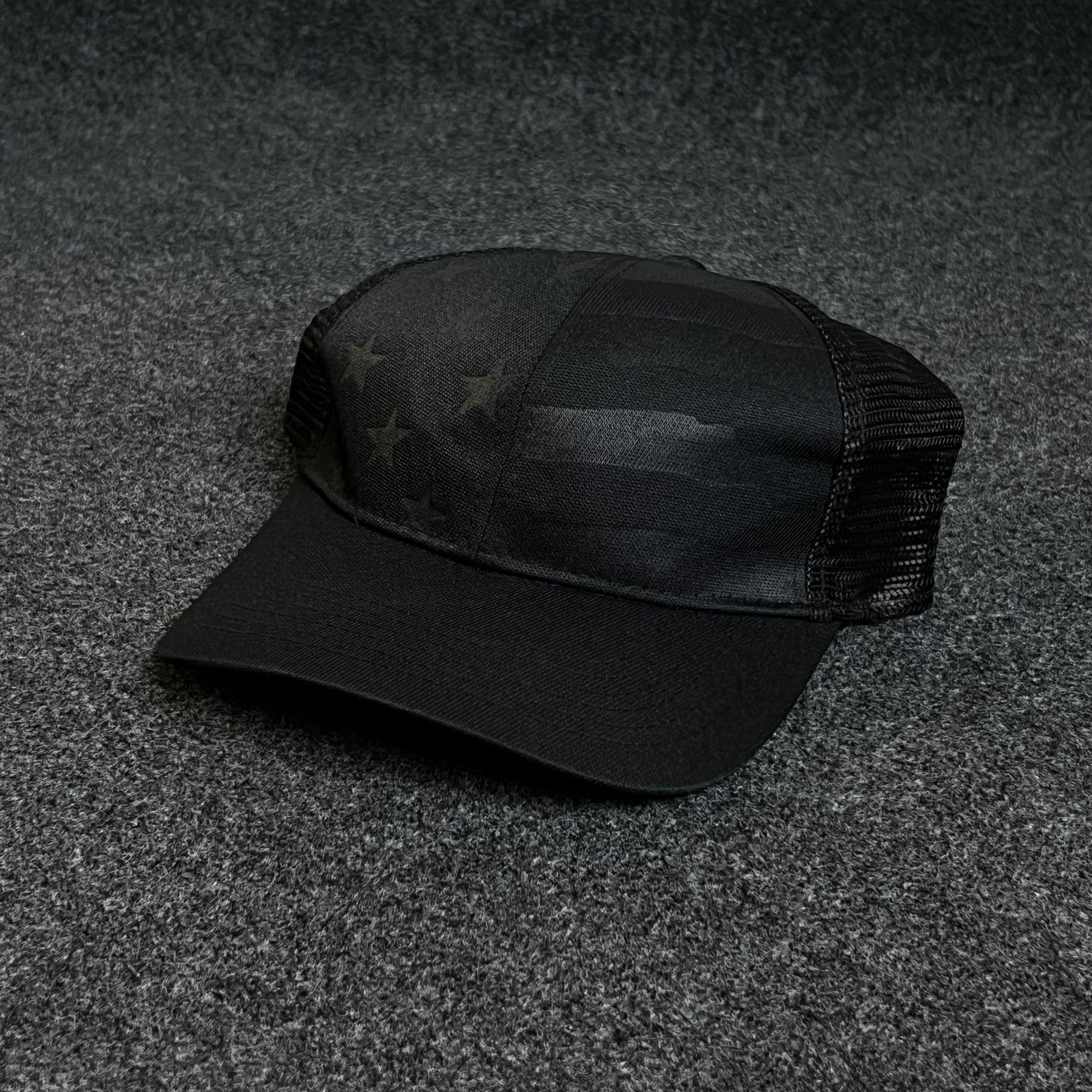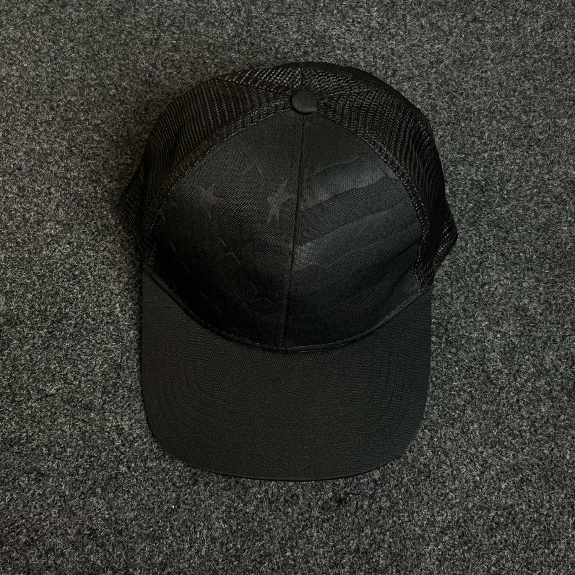 Rep the rugged and sleek style with this black trucker cap featuring a subtle tonal American flag design on the front panels. It has a classic black curved brim with breathable black mesh back panels for ventilation and an adjustable snapback for a perfect fit. The look is durable and understated, perfect for those who appreciate a minimalist yet bold design.