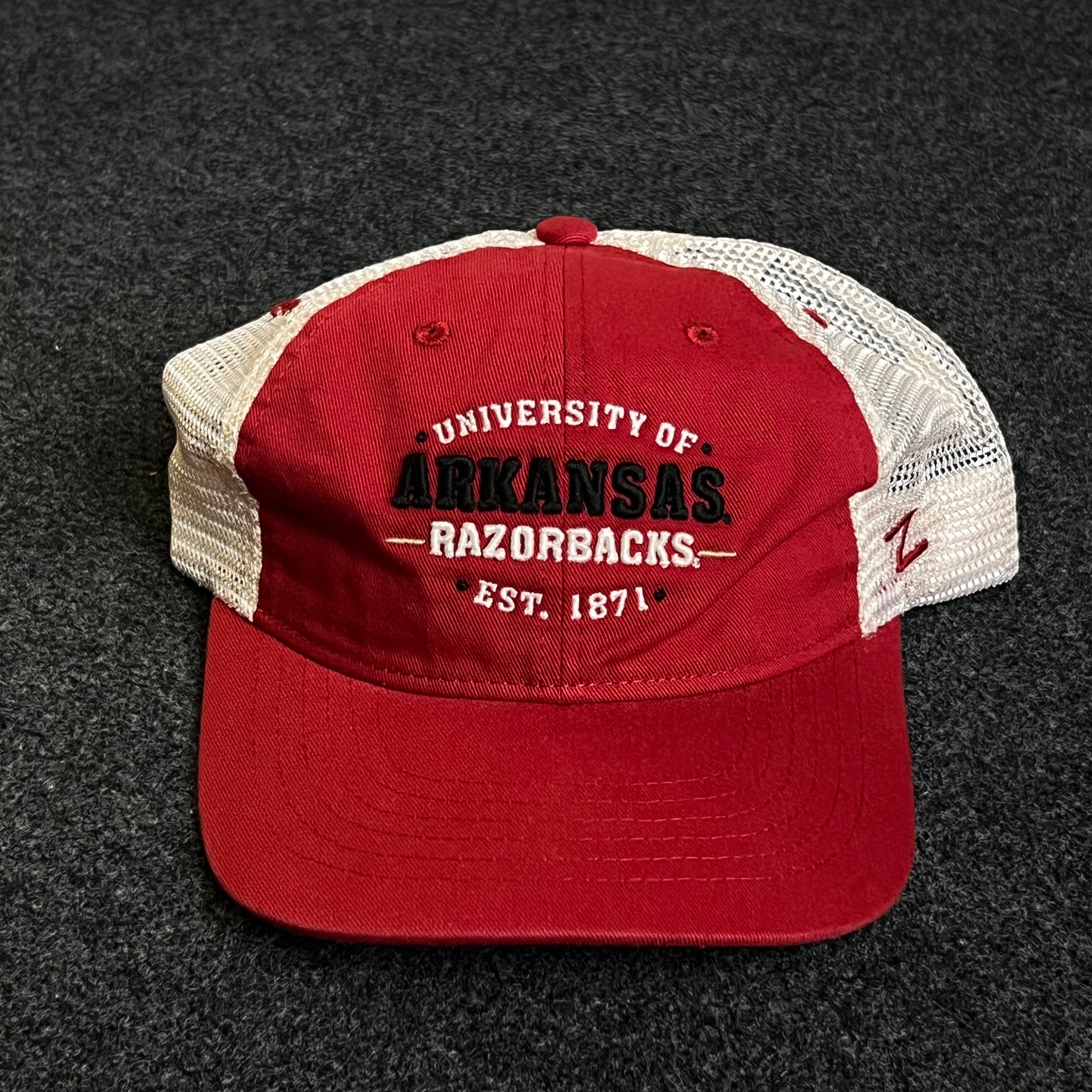 Show your Hogs pride with this Arkansas Razorbacks trucker cap featuring a red front and brim, breathable white mesh back, and bold collegiate embroidery (University of Arkansas β’ Razorbacks β’ Est. 1871). Lightly distressed for that perfectly broken-in look.
