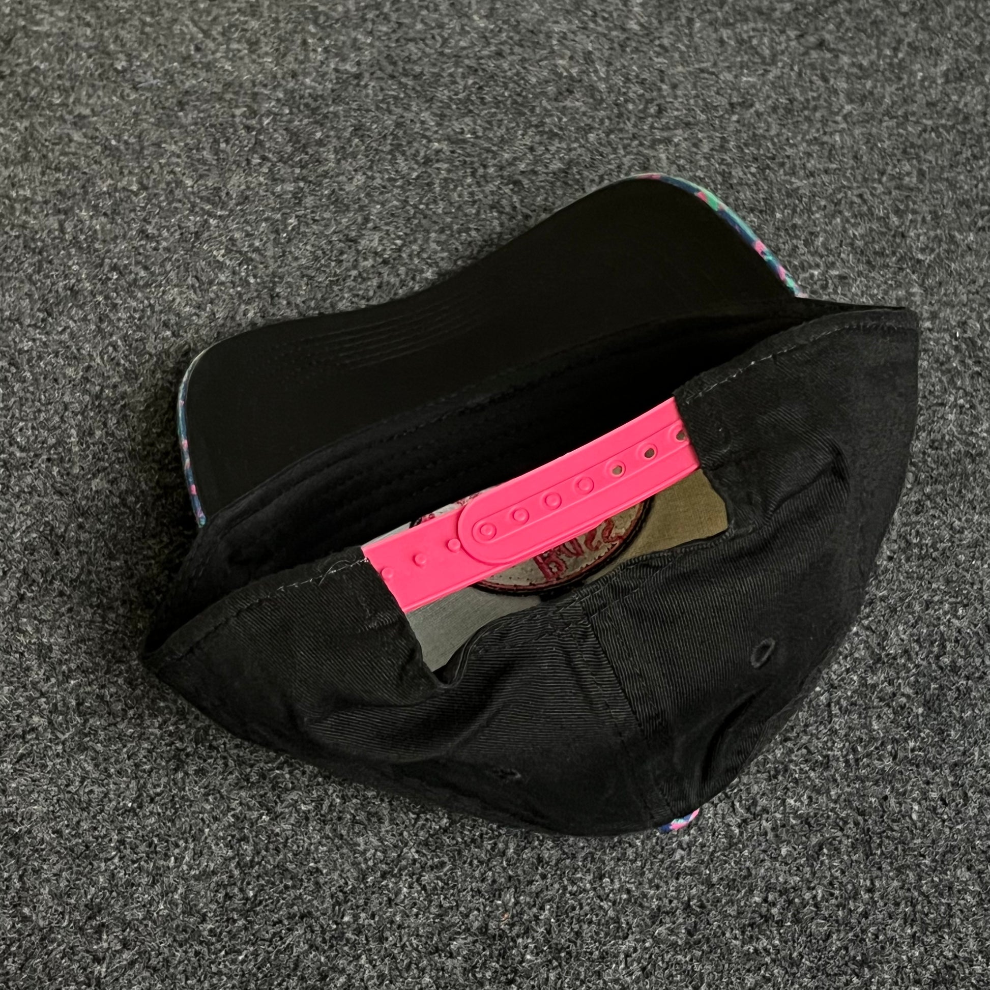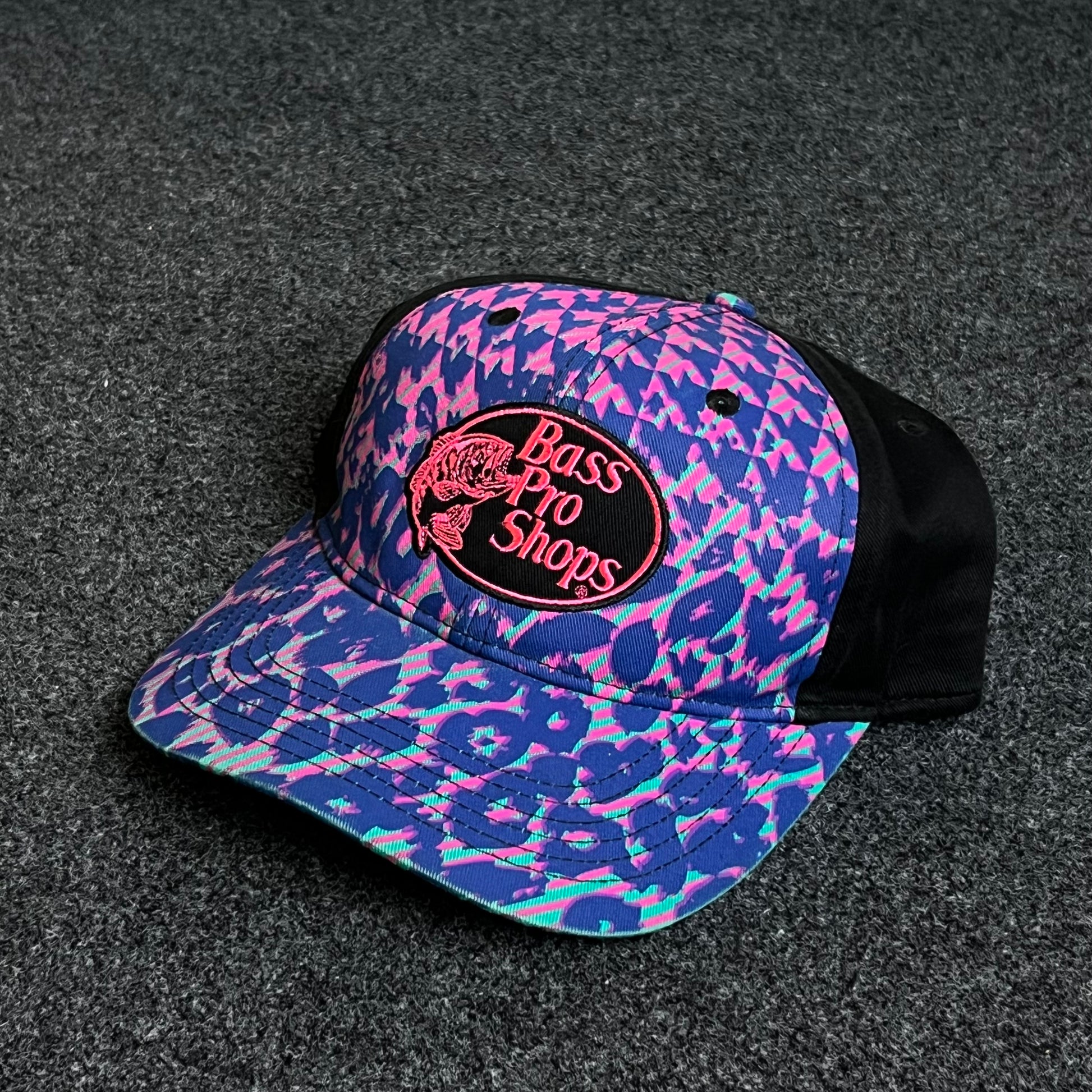 This is a Bass Pro Shops Animal Print Mesh Baseball Cap, featuring a vibrant mix of purple and pink animal print on the front panels and bill, paired with black mesh on the back for ventilation. The front showcases a bold, embroidered Bass Pro Shops logo patch in neon pink and black, combining fishing culture with a playful, streetwear-inspired twist. Designed with an adjustable snapback for one-size-fits-most comfort, this hat is lightweight, breathable, and perfect for making a unique fashion statement while enjoying the outdoors.