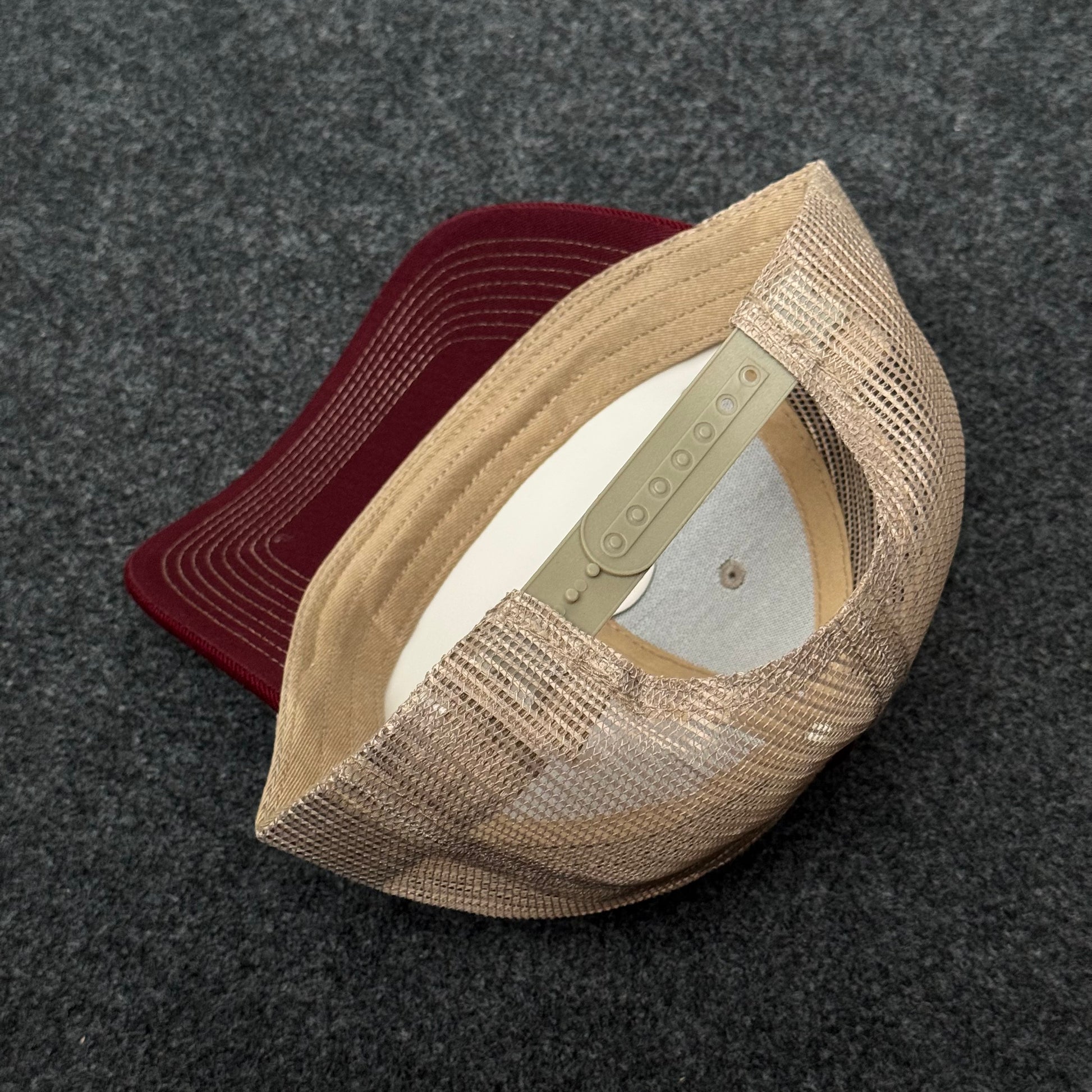 Add timeless style to your collection with this two-tone trucker cap. The structured beige crown and top button are complemented by a deep burgundy bill and contrast stitching, while the breathable tan mesh back panels keep you cool in any setting. Perfect for everyday wear, sporting events, and outdoor adventures.