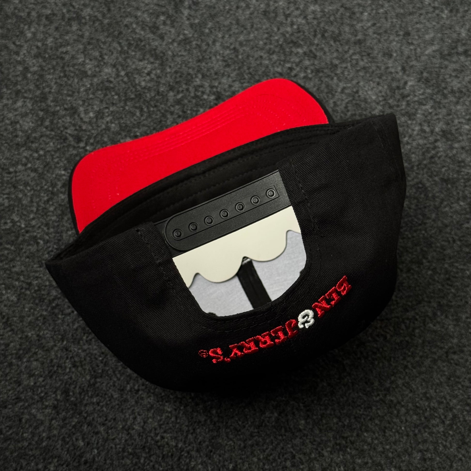 This cap offers a clean and modern look with a hint of playful attitude. It features an all-black, structured six-panel build with a curved bill. The front is adorned with a round patch: a red circle with a white interior, containing a bold black silhouette of two dogs sitting back-to-back. This central, minimal graphic pops crisply against the black background, making it both easily recognizable and versatile for casual wear. The cap likely features an adjustable closure on the back (not visible in the image).