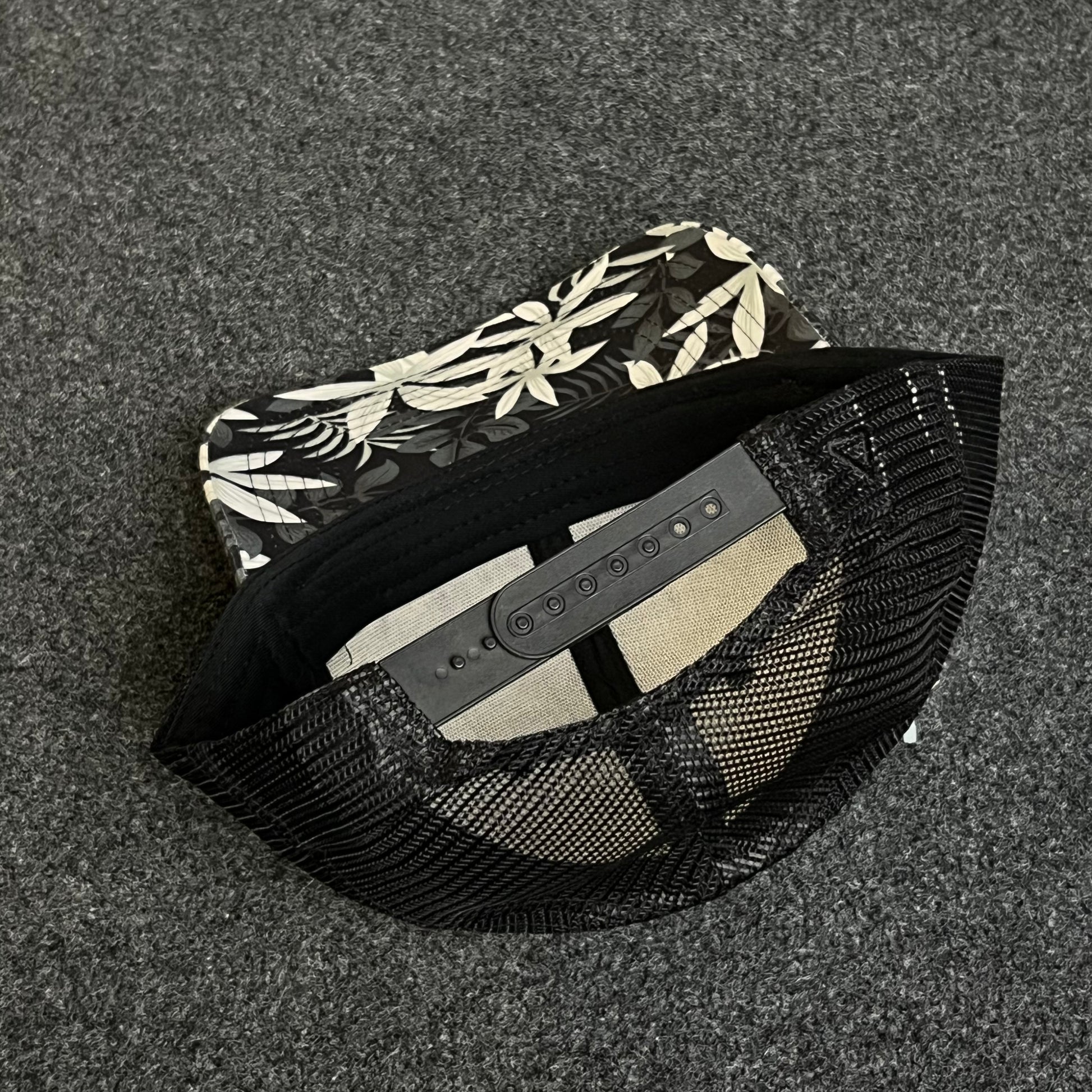 🧢 Black front panels and brim with white/gray tropical leaf print