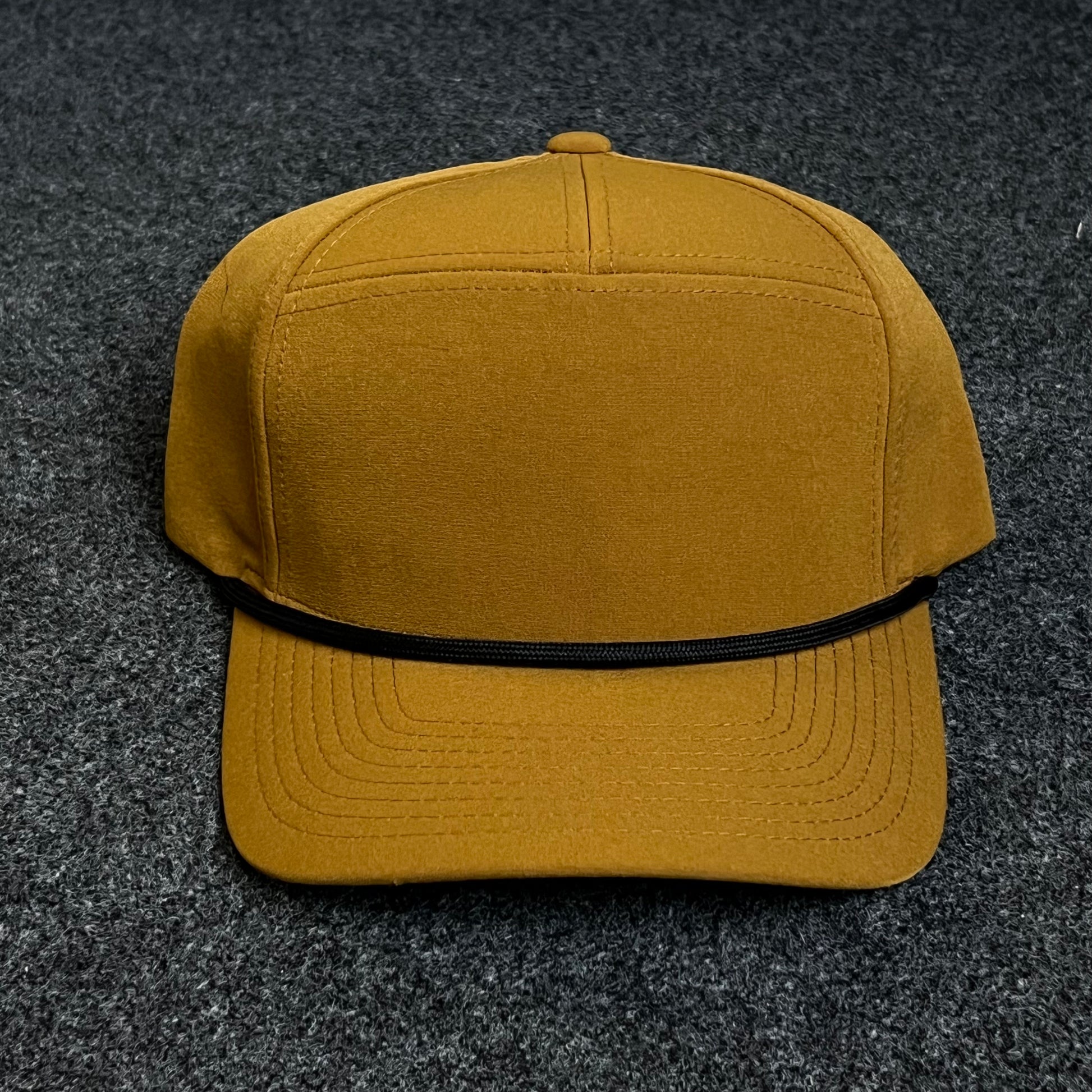 It features a solid mustard yellow crown and bill, with a black rope accent running above the brim for a touch of retro flair. The hat has a structured, high-profile build, making it ideal for custom logo embroidery, casual wear, or as a bold, minimalist statement accessory.