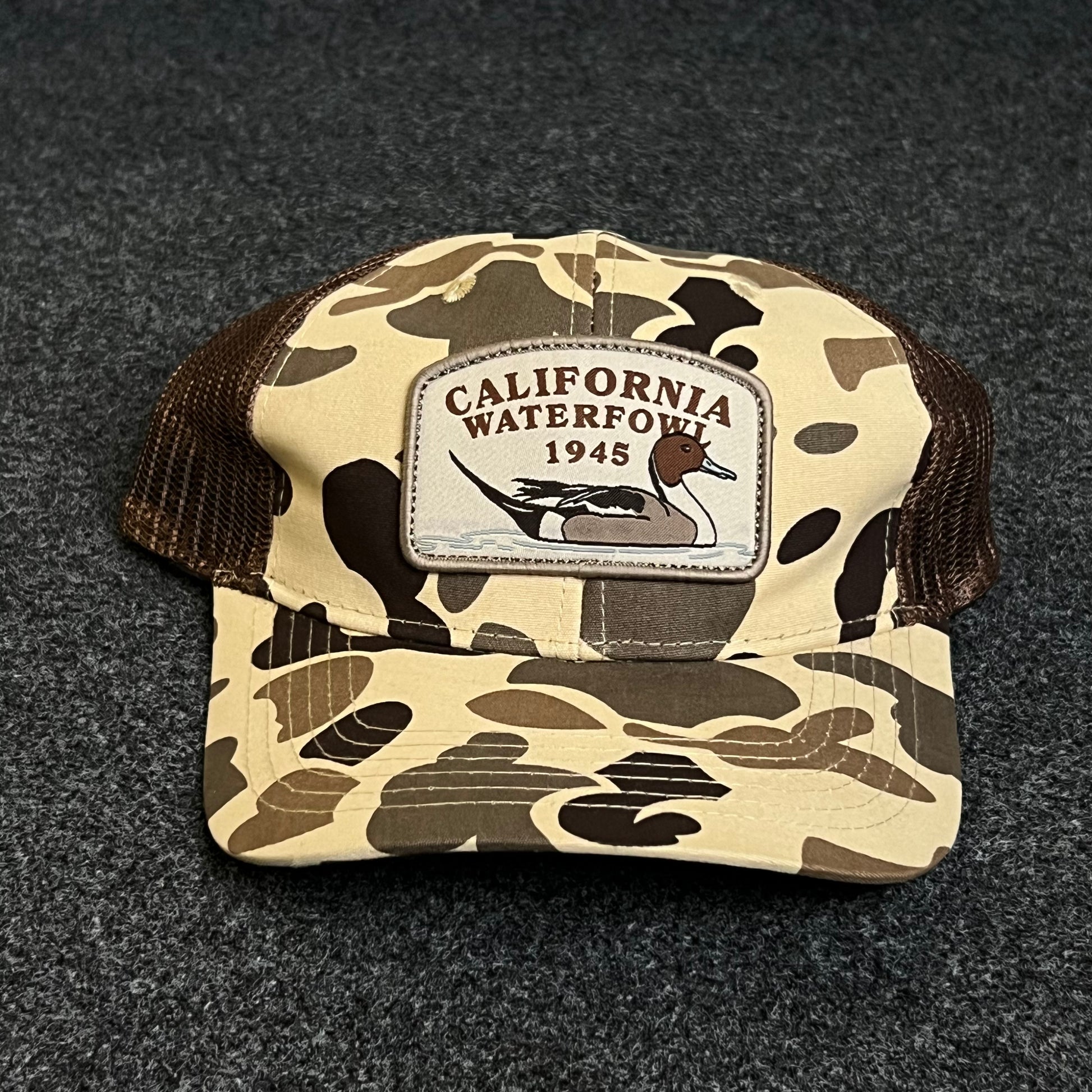 Rep the outdoor spirit with this California Waterfowl Trucker Camo Cap, offering classic camo styling, lightweight mesh comfort, and adjustable fit for fans of adventure and heritage.