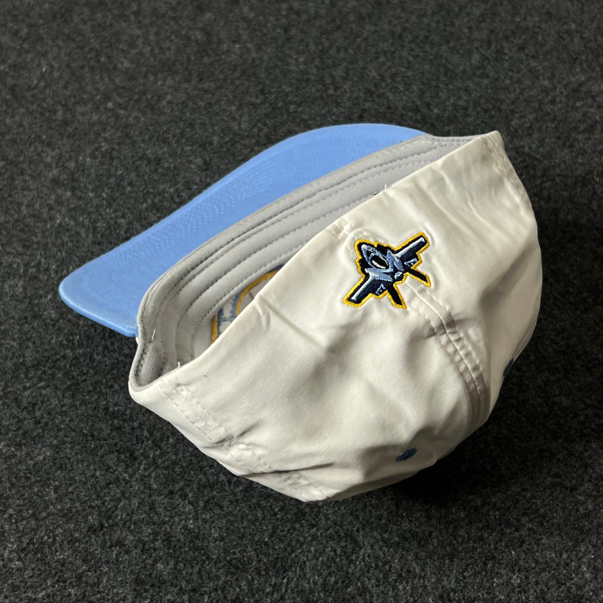 🔵 Sky-blue brim and eyelets with navy top button for balance