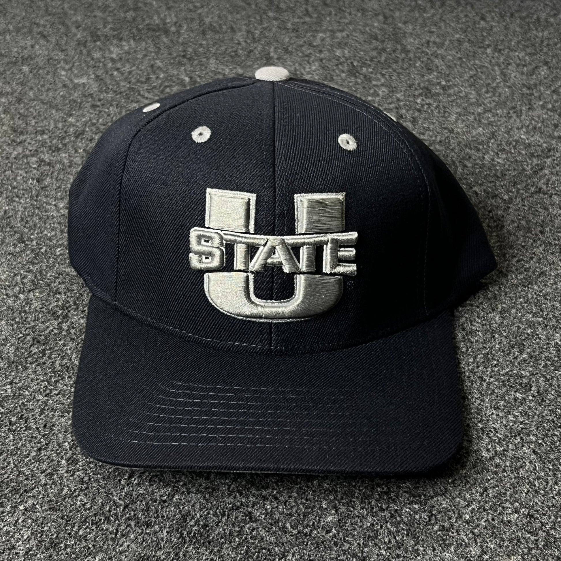 Show off your school pride with this Capelli Sport fitted cap featuring a striking embroidered U STATE logo across the front. The sleek black crown and brim provide a strong, athletic base, while crisp white embroidery and eyelet accents bring sharp contrast. Perfect for athletes, students, alumni, and fans who want to rep their team with classic style.