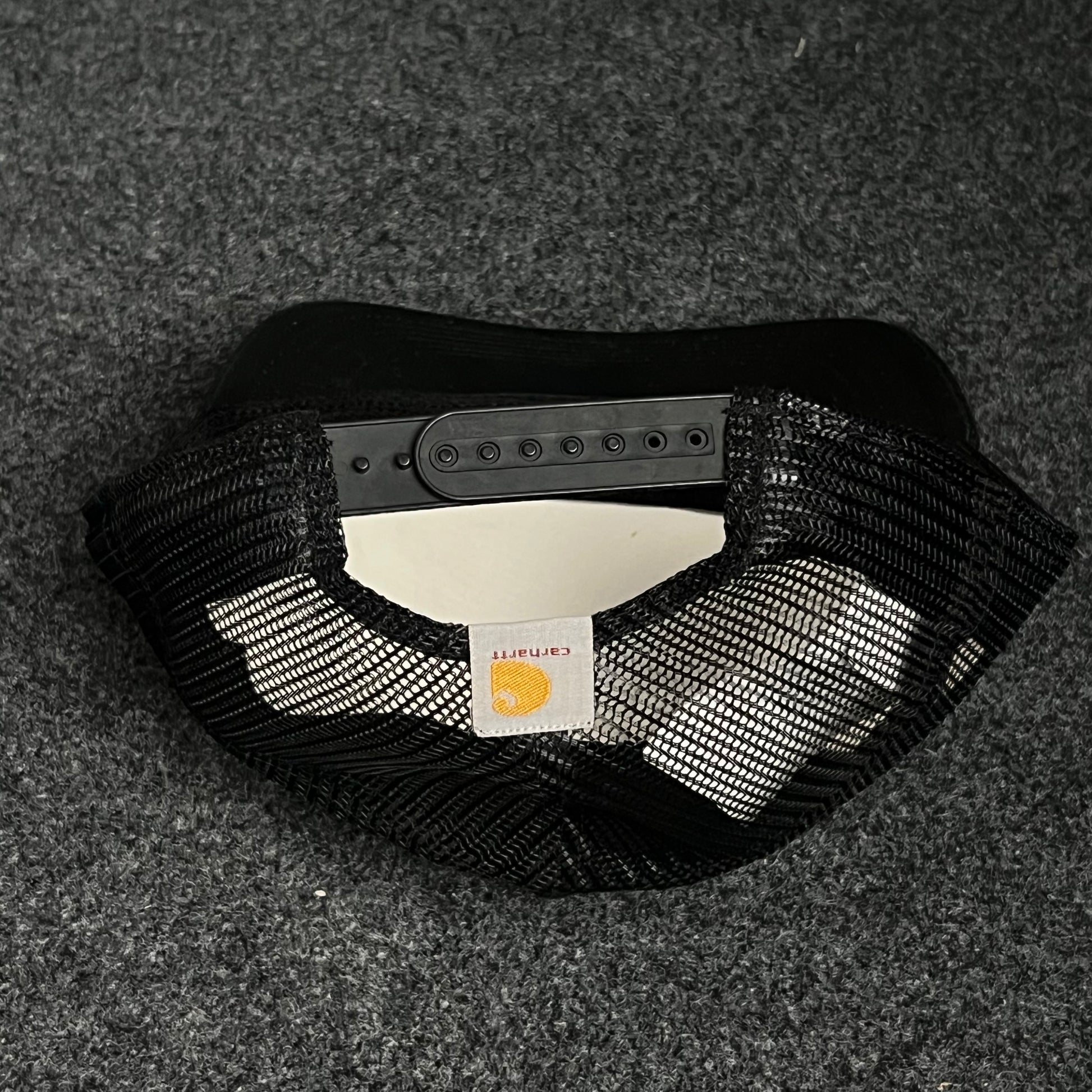 This is a Carhartt mesh-back trucker cap in black, featuring bold yellow script embroidery with “Carhartt” and “Since 1889” across the structured front panel. The cap has a black mesh back for maximum breathability, a pre-curved visor, and classic snapback adjustability. This modern design blends Carhartt’s legendary workwear roots with a fresh, standout look for everyday style.