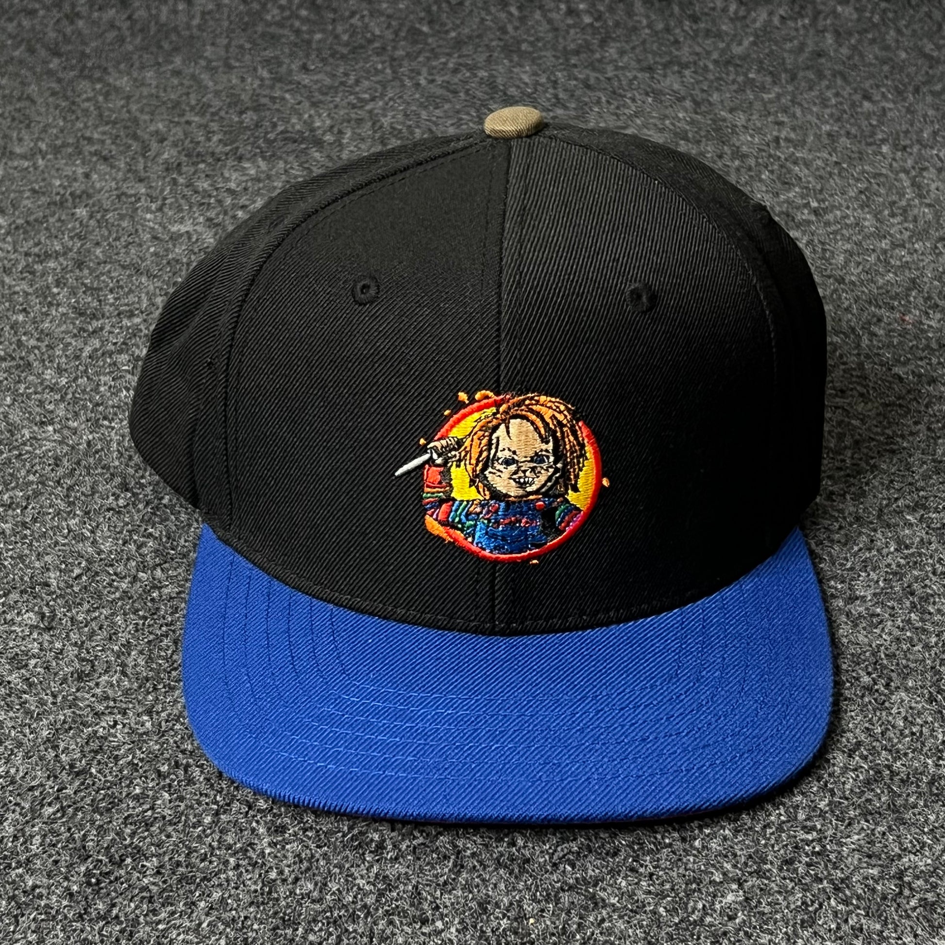 Bring a killer edge to your style with this Chucky flat cap. Featuring an embroidered Chucky patch front and center, this cap mixes horror flair with street-ready design. The sleek black crown contrasts with a sharp royal blue brim, while the structured fit makes it perfect for collectors and fans of bold, pop-culture style.