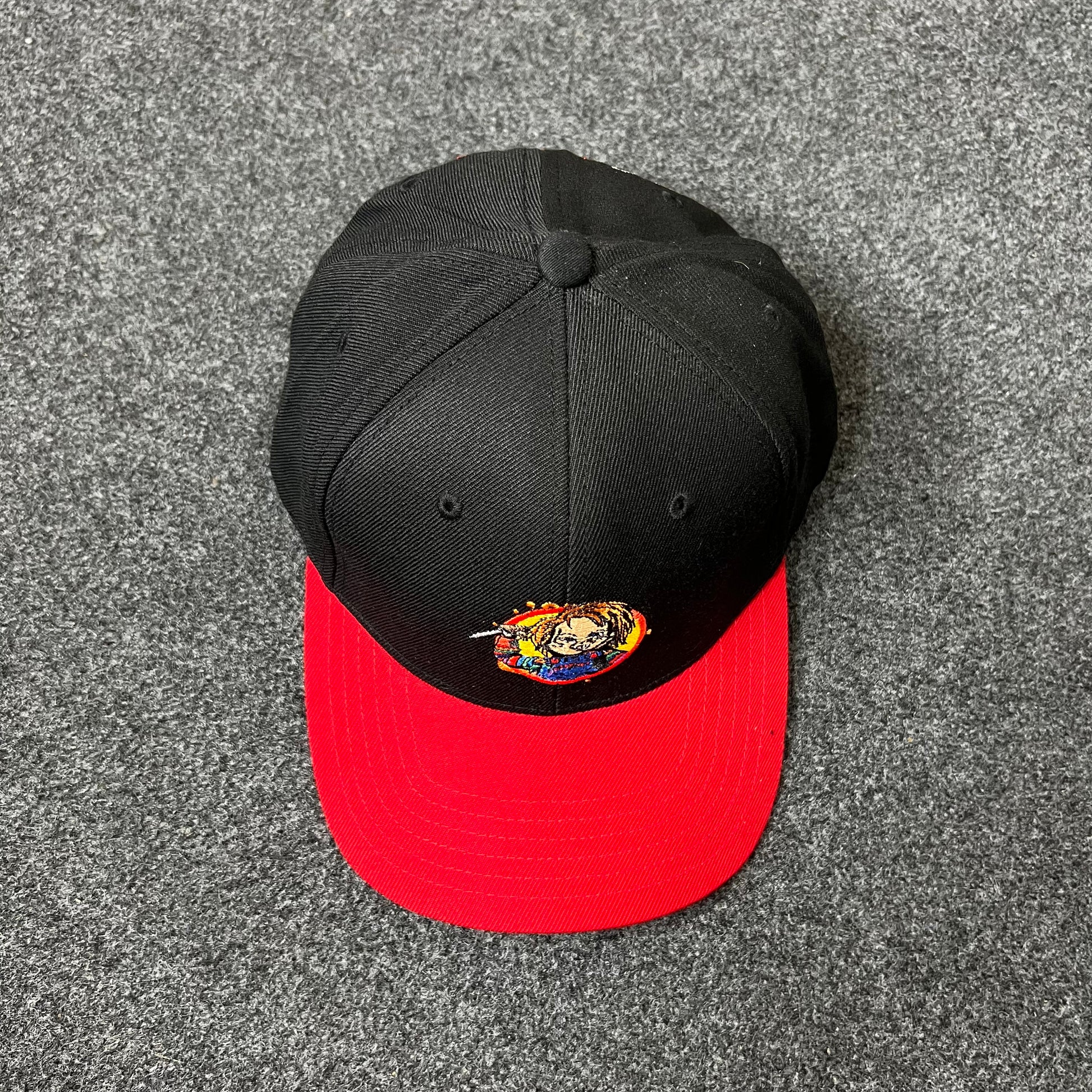 Show off your love for classic horror with the Chucky Horror Graphic Hat. Featuring a structured black crown, a bold embroidered Chucky character graphic on the front, and a contrasting red brim, this cap delivers standout style with a pop-culture edge. Perfect for horror fans, collectors, and anyone who loves a bold statement piece.