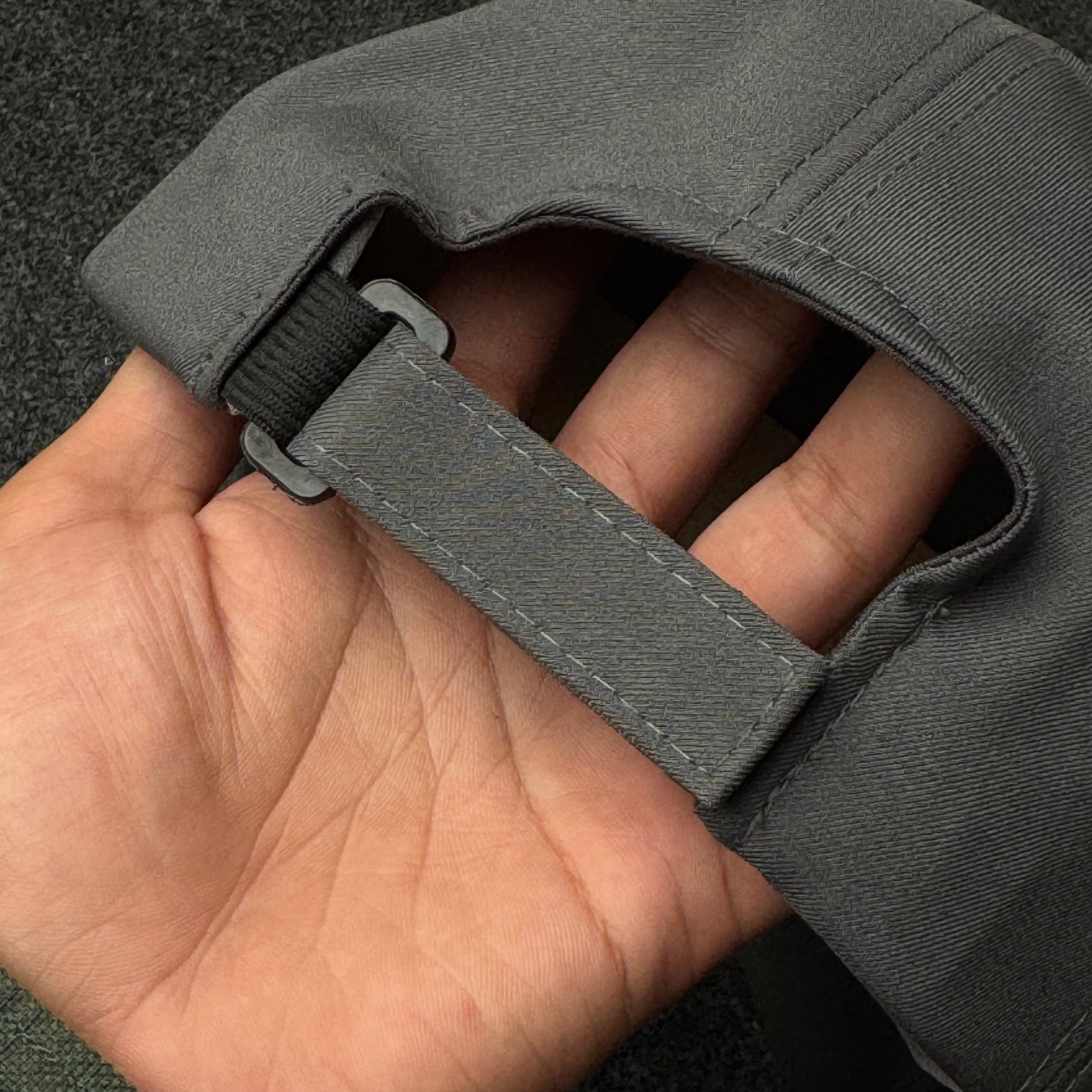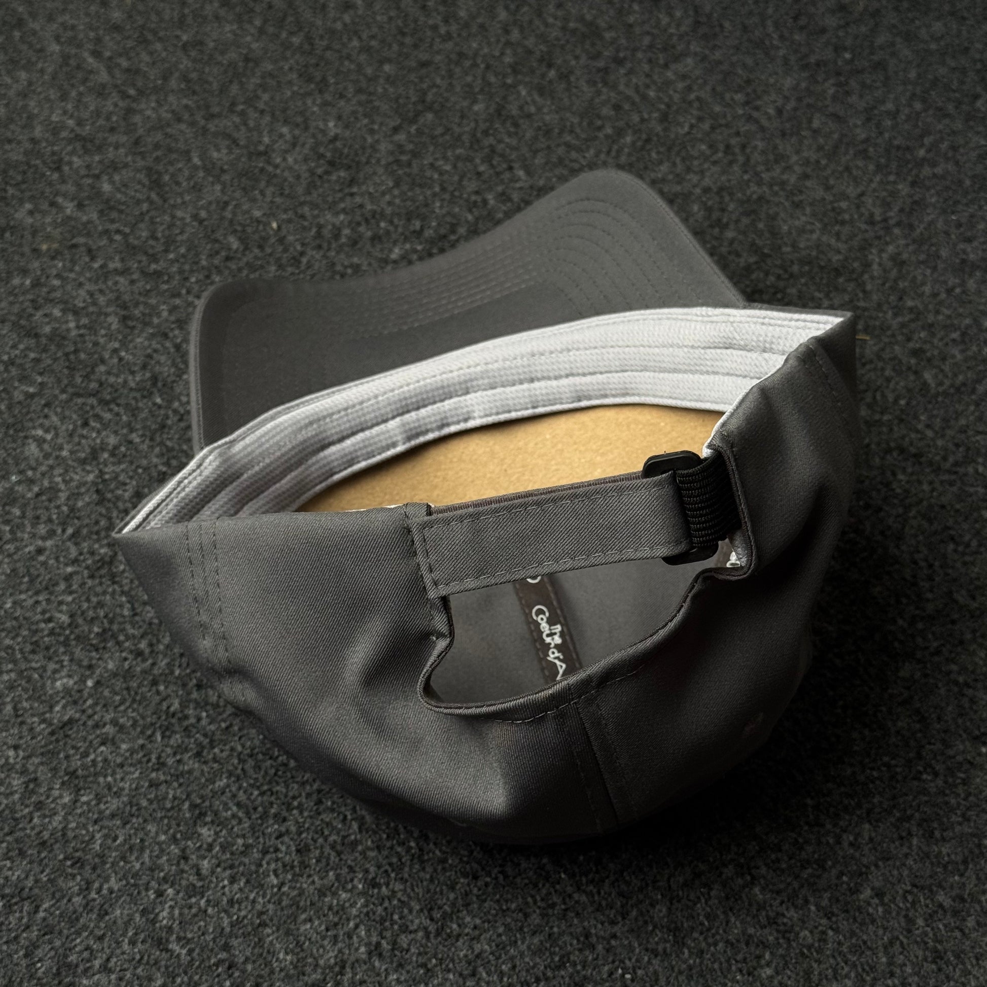 The Build: A classic six-panel dad hat constructed from charcoal grey cotton twill. It features a relaxed, unstructured crown and a matching pre-curved visor with tonal multi-row stitching for a sleek, versatile silhouette.