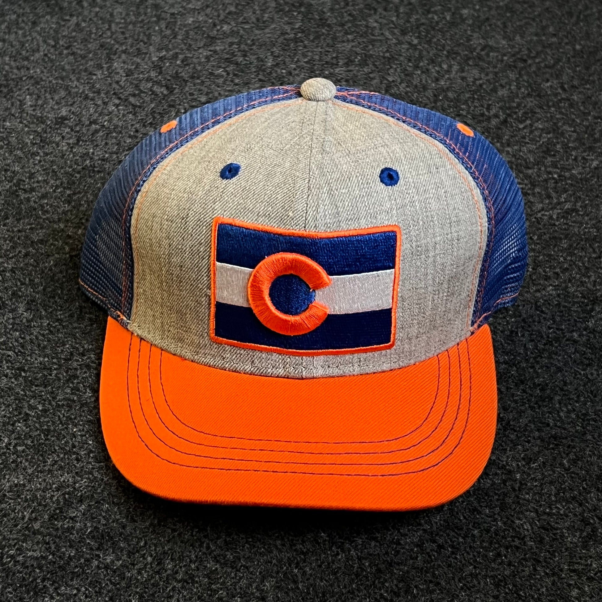 This cap is a bold tribute to Colorado, featuring a bright orange pre-curved bill, heather gray structured front, and royal blue mesh sides/back with orange stitching for maximum visibility and style. The front panel highlights the Colorado state flag in a detailed, high-relief embroidered patch with a classic orange "C" and gold circle. Royal blue accent eyelets and a top button complete the coordinated look, while a snapback closure delivers flexible, all-day comfort.