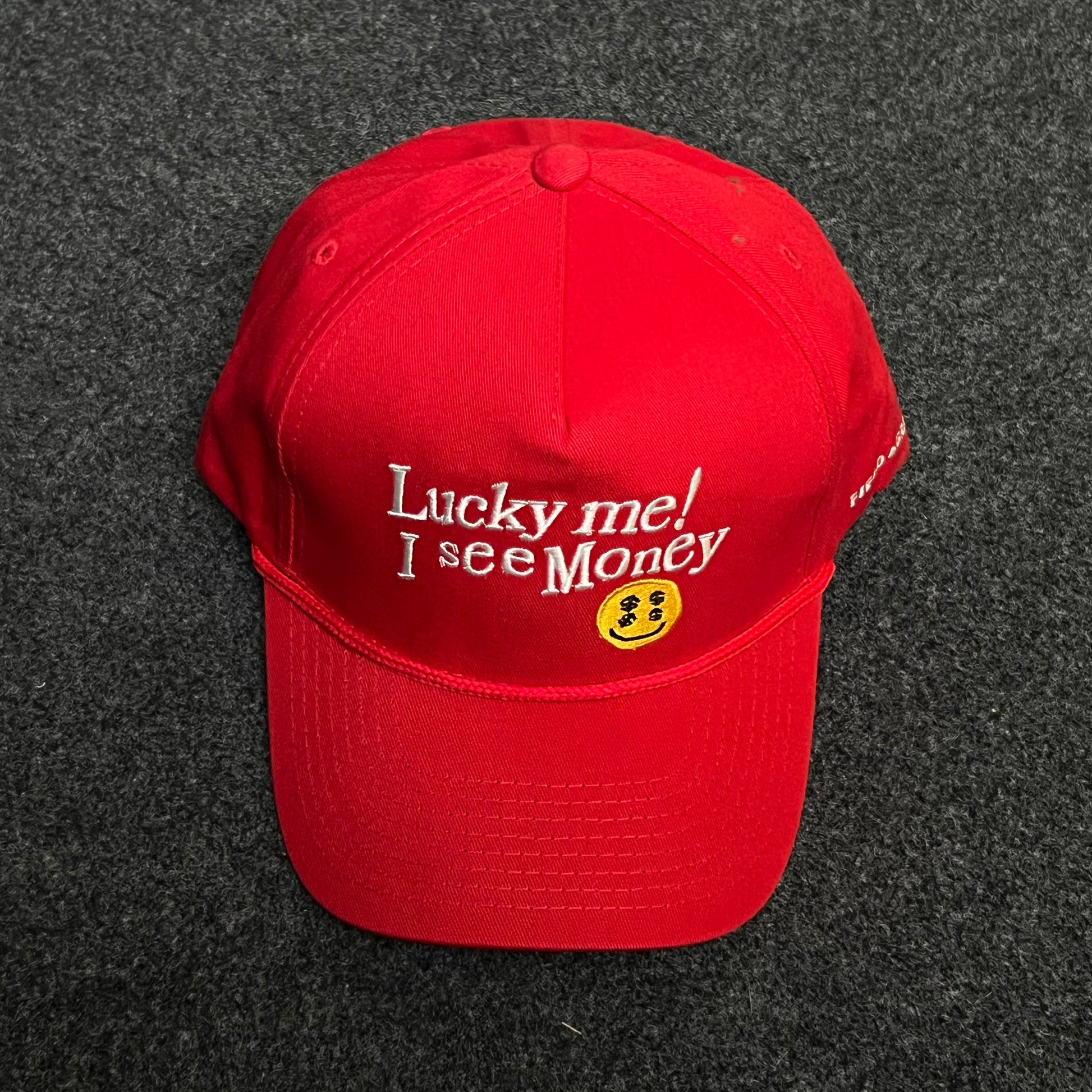 Red "Lucky me! I see Money" Smiley Cap