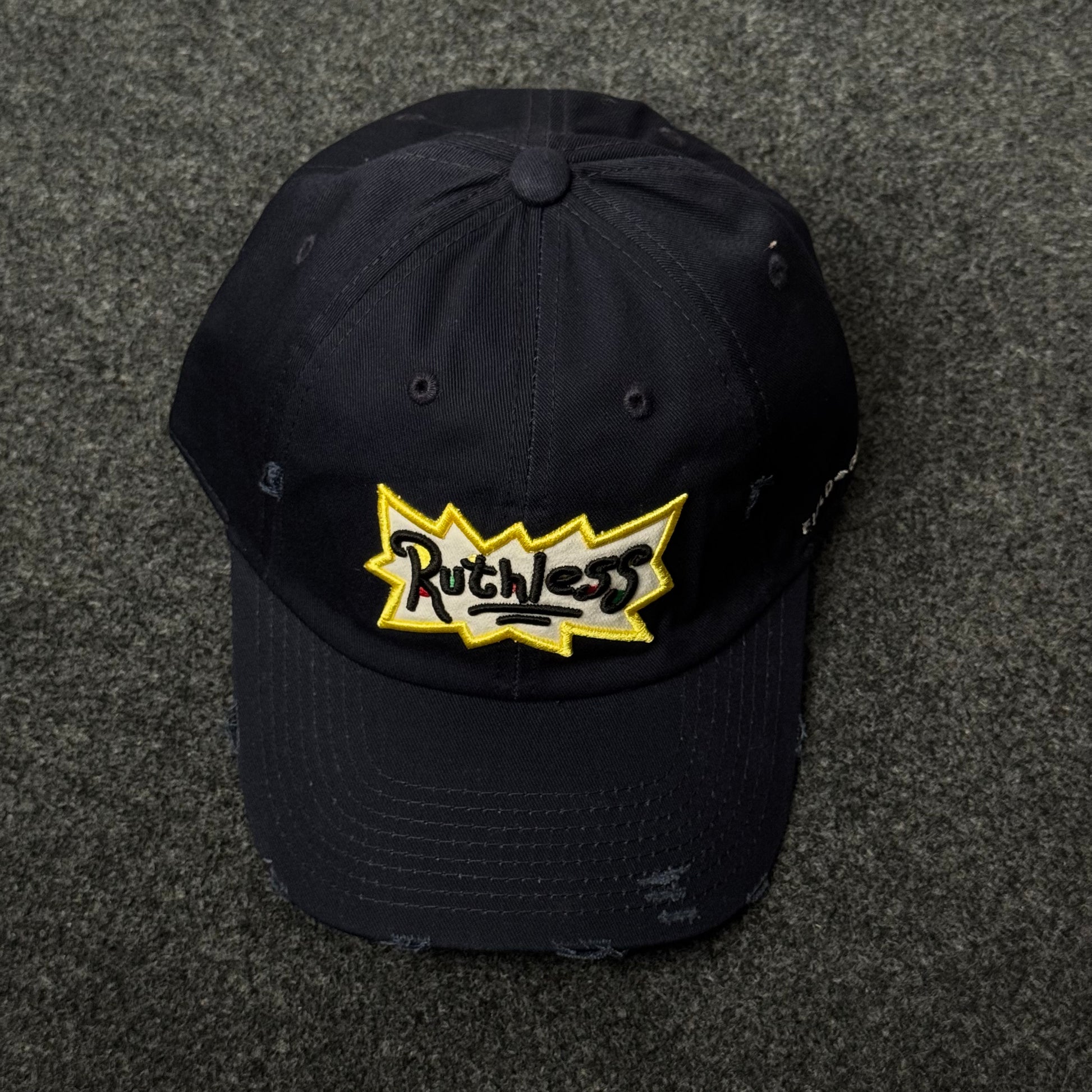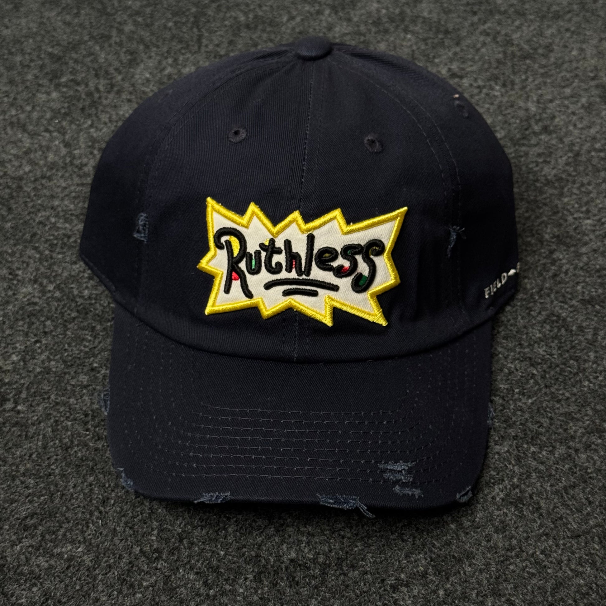 This cap stands out with a street-art vibe and an edgy, distressed look. The black unstructured crown is filled with subtle abrasions and “rips” for a worn-in, lived look. Dominating the front is a graffiti-style embroidered patch reading “Ruthless” in black, yellow, and pops of red and green, with sharp lightning-bolt edges framed by a bold yellow outline for maximum visual impact. On the right side, near the bill, white embroidery reads "FIELD".