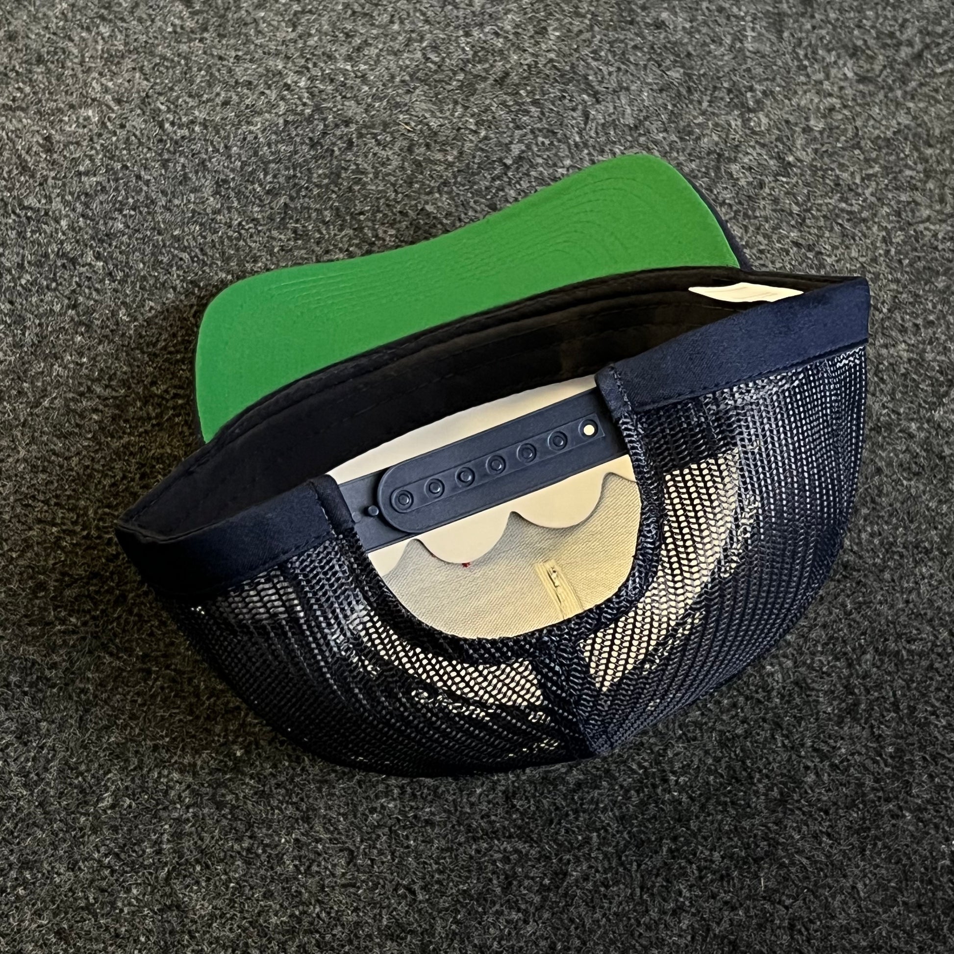 🧢 Structured navy front, curved bill, and matching mesh back for all-day comfort