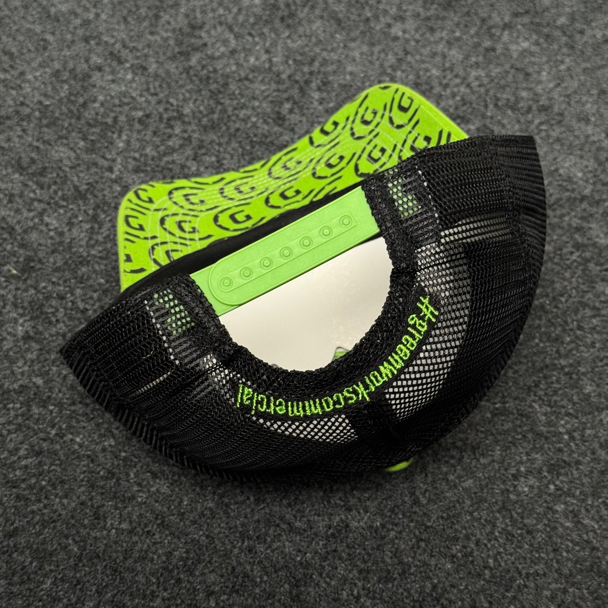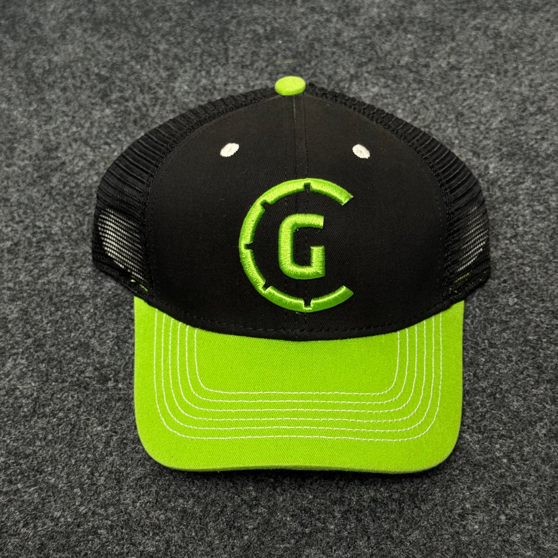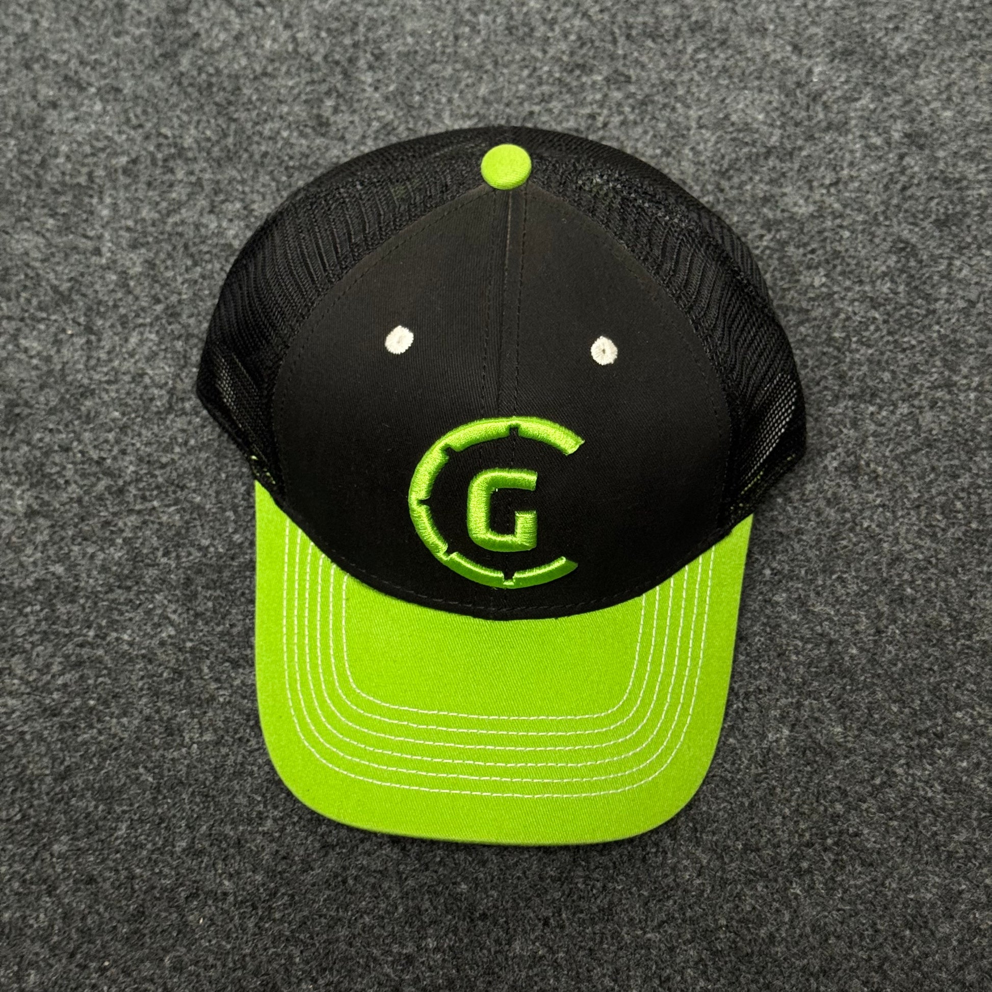 Turn heads with this vibrant black and neon green trucker curve cap. The front shows off a bold “G” logo in green embroidery, surrounded by a matching accent ring for a striking 3D look. Classic black mesh panels and a curved neon green bill provide breathable comfort and bold street style.