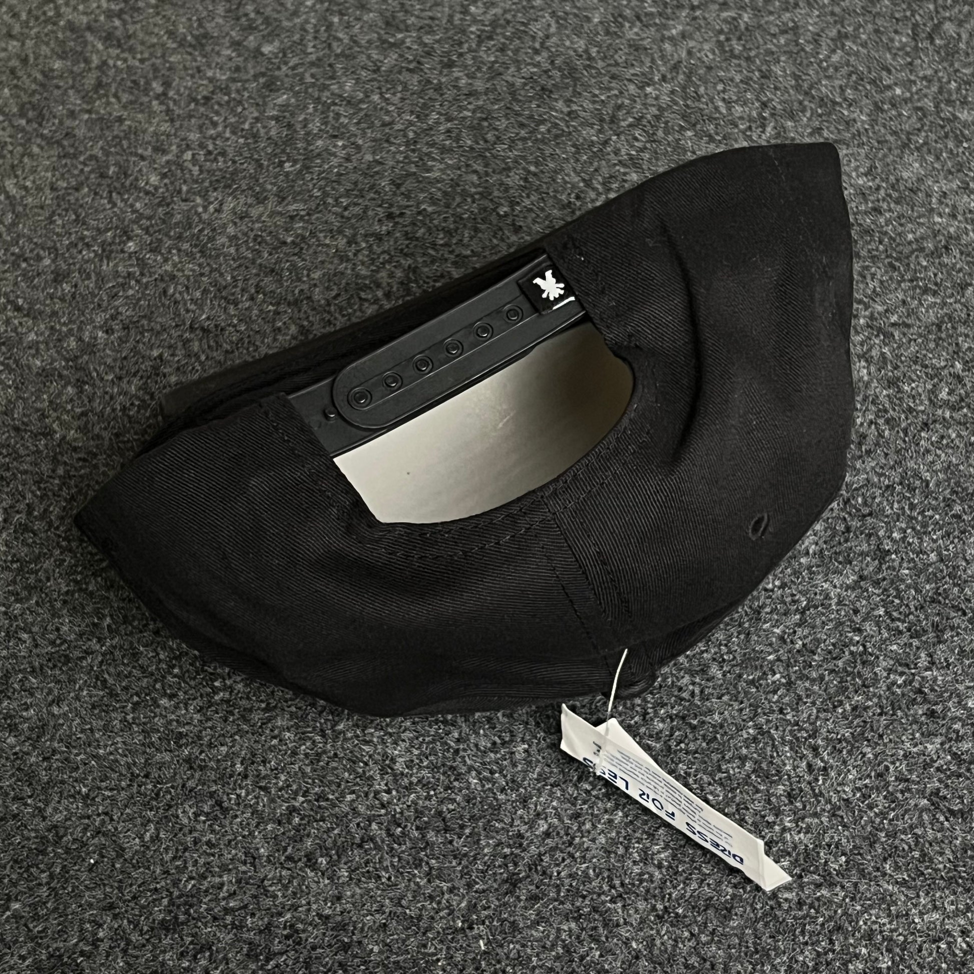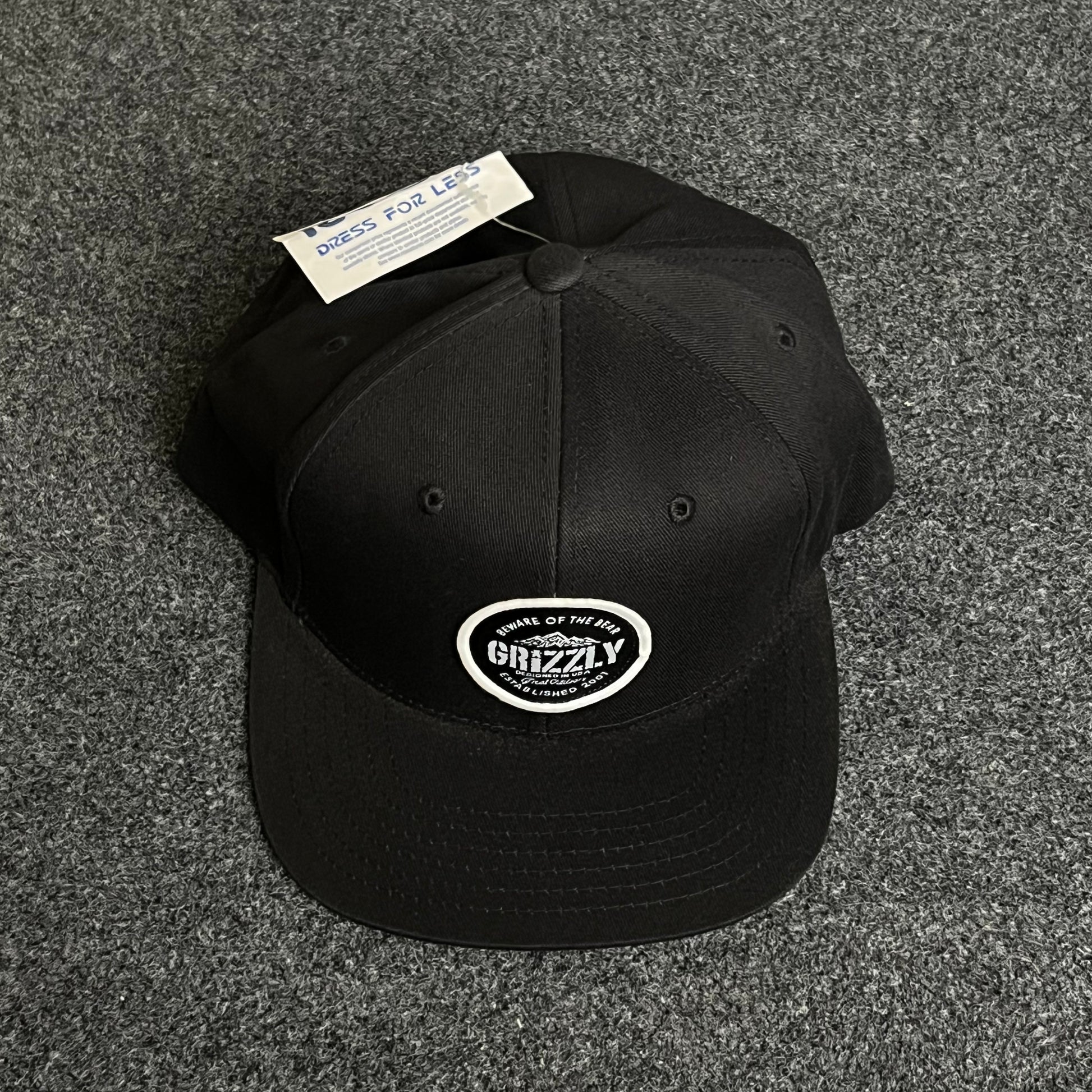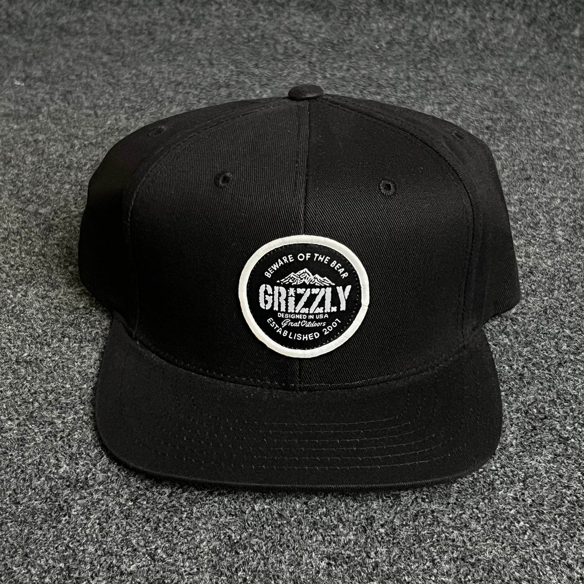 The image shows a black snapback cap featuring a round, high-contrast woven "GRIZZLY" patch logo on the front. This classic streetwear cap style is favored for its bold branding and versatile look.