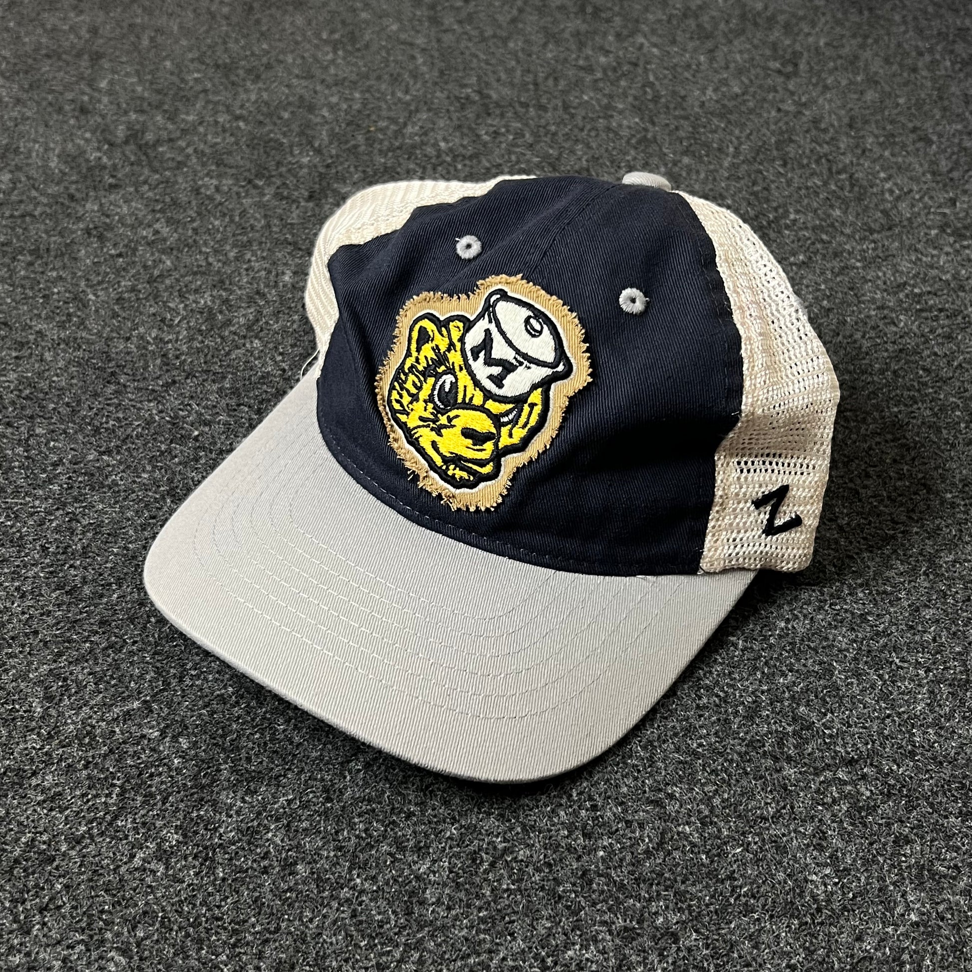 Bring bold energy to your look with this Grizzly Mascot Trucker Hat. Featuring a fierce embroidered bear logo wearing a classic cap, this design blends school pride and street style. The navy crown, breathable white mesh back, and light gray brim give it a sharp two-tone contrast that works for everyday wear or game-day support.