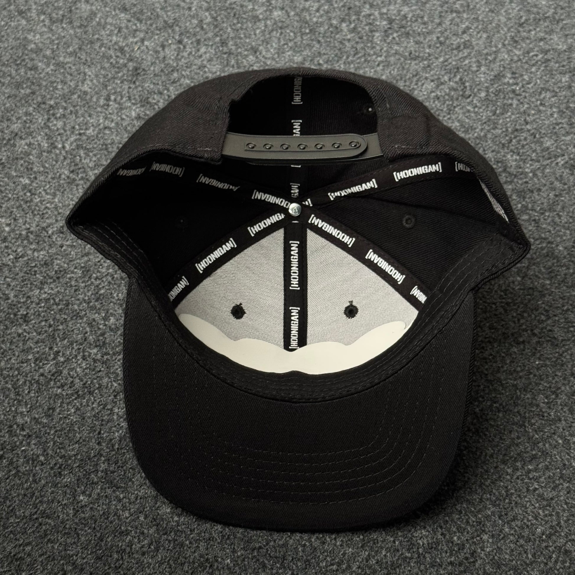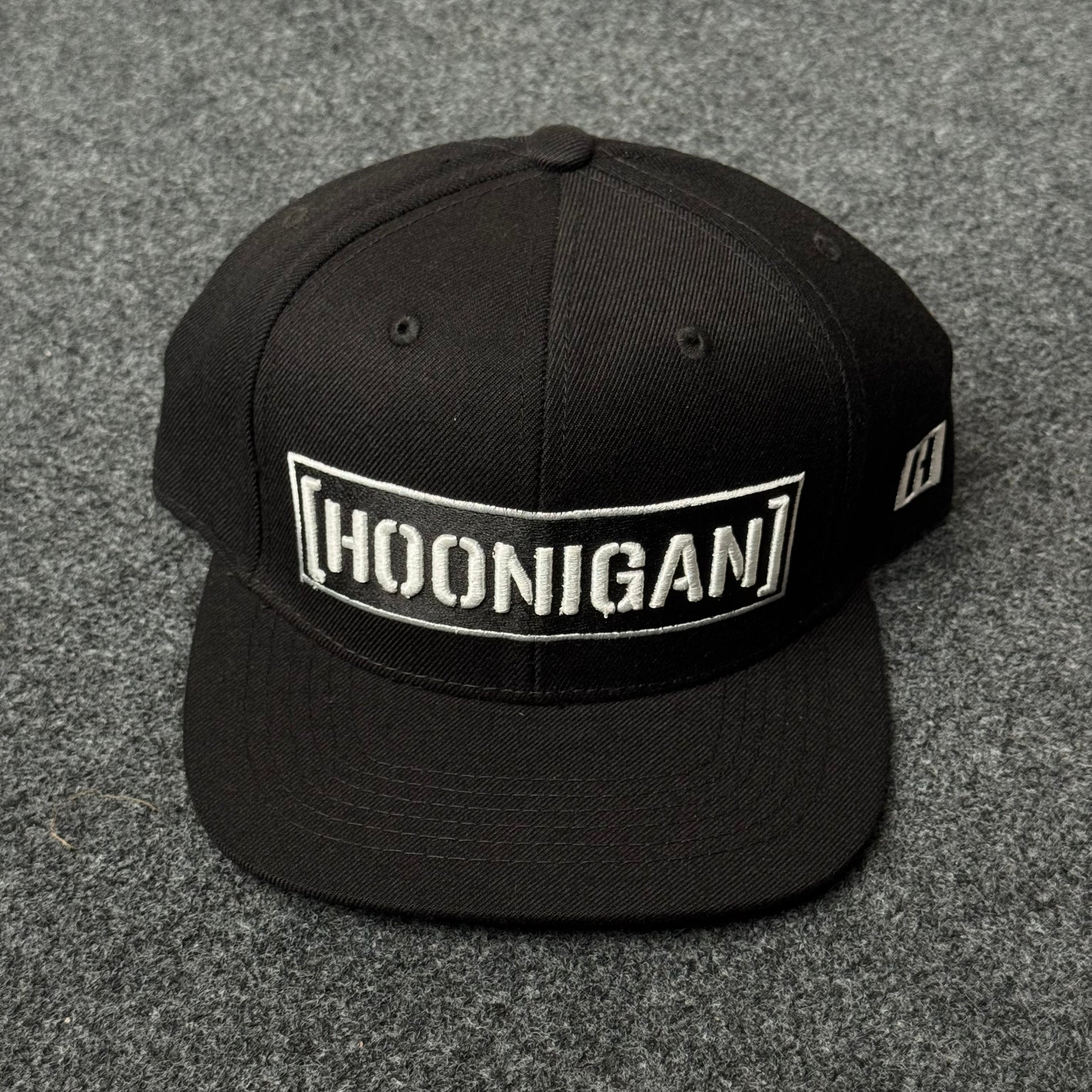 Iconic Hoonigan boxed logo embroidered in white on structured black panels