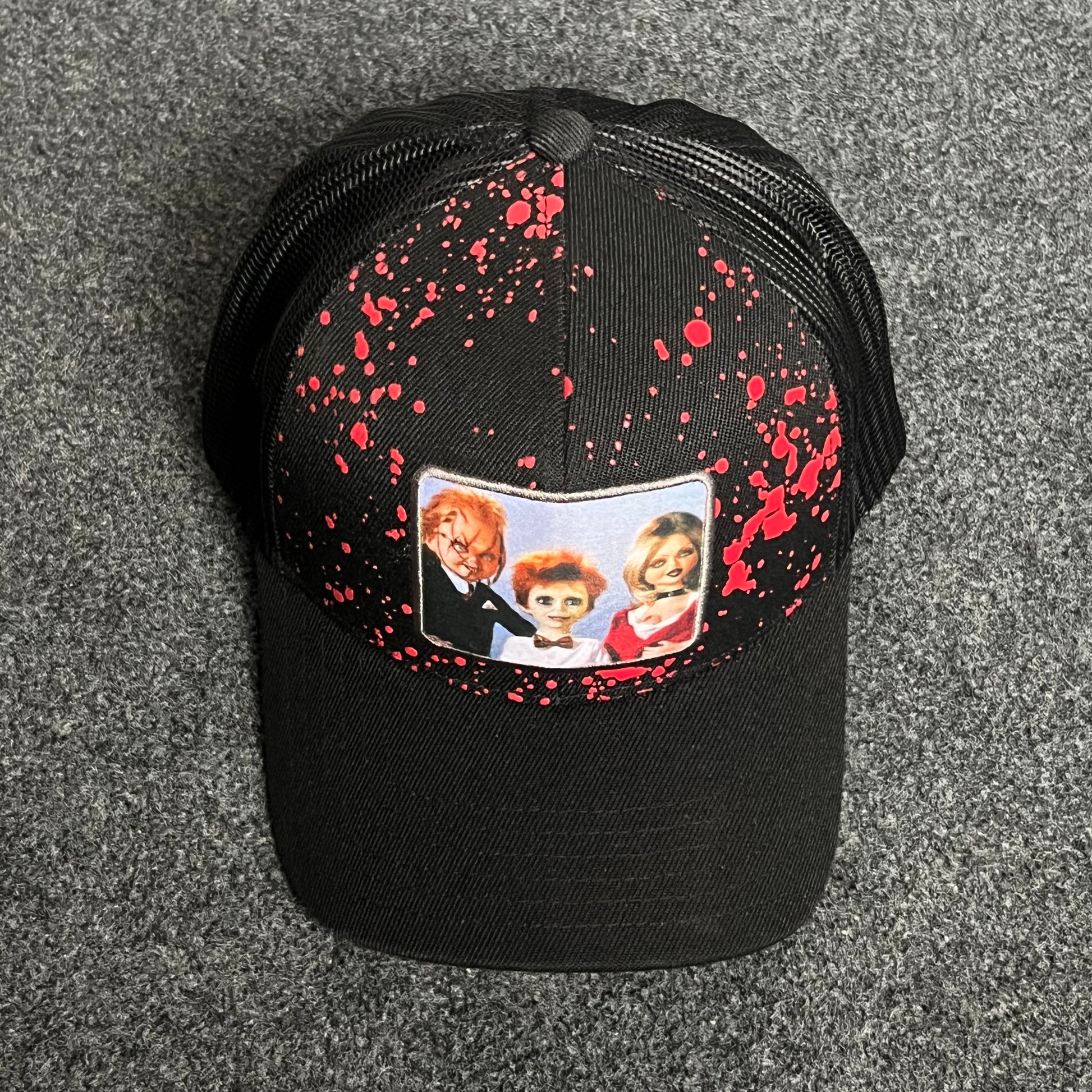 Stand out in bold style with this black trucker cap featuring a horror-inspired patch graphic of creepy doll-like characters. Red paint splatter details across the crown add an edgy, artistic vibe, while the mesh back keeps things breathable and comfortable.