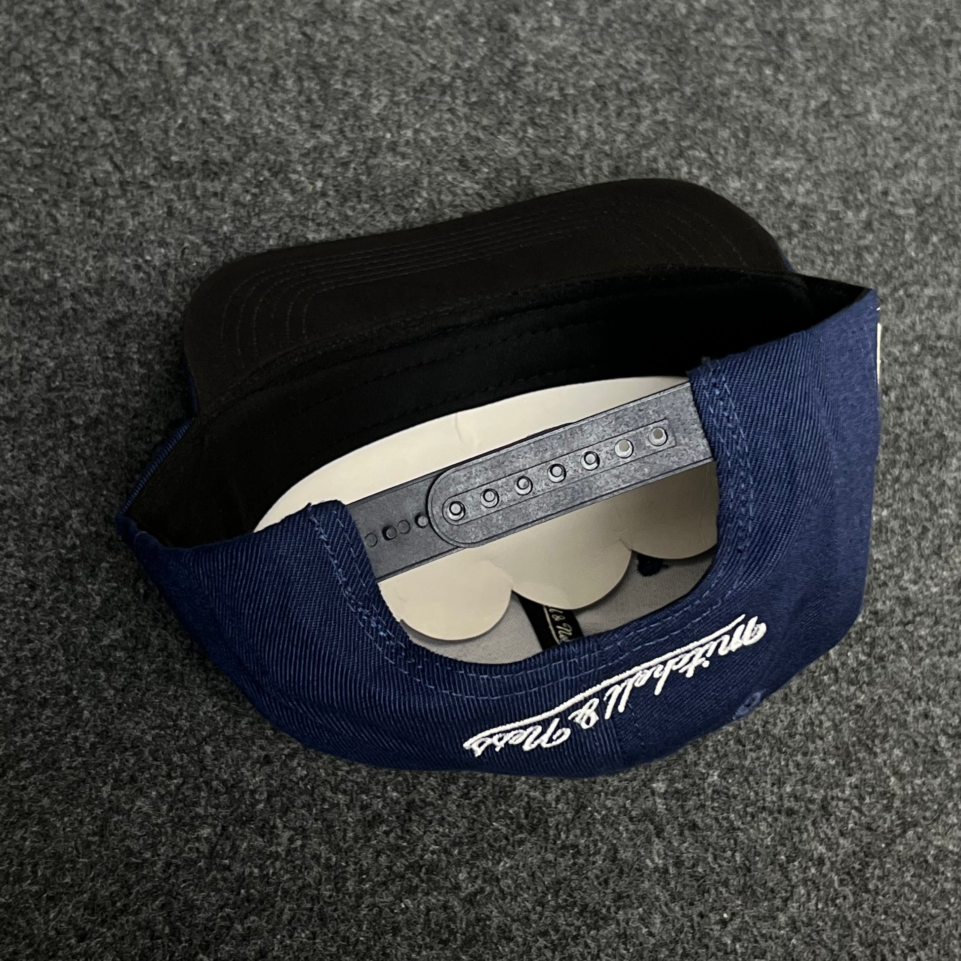 🧢 Structured six-panel crown and flat brim, all in deep navy blue