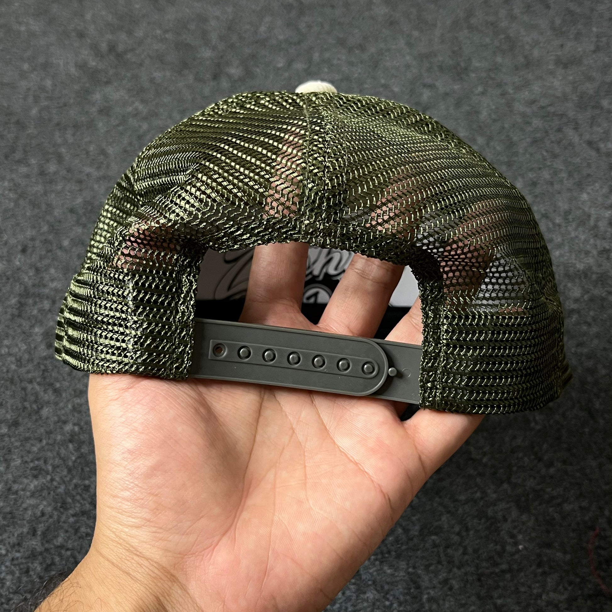 🌴 Tan crown with olive green mesh back
