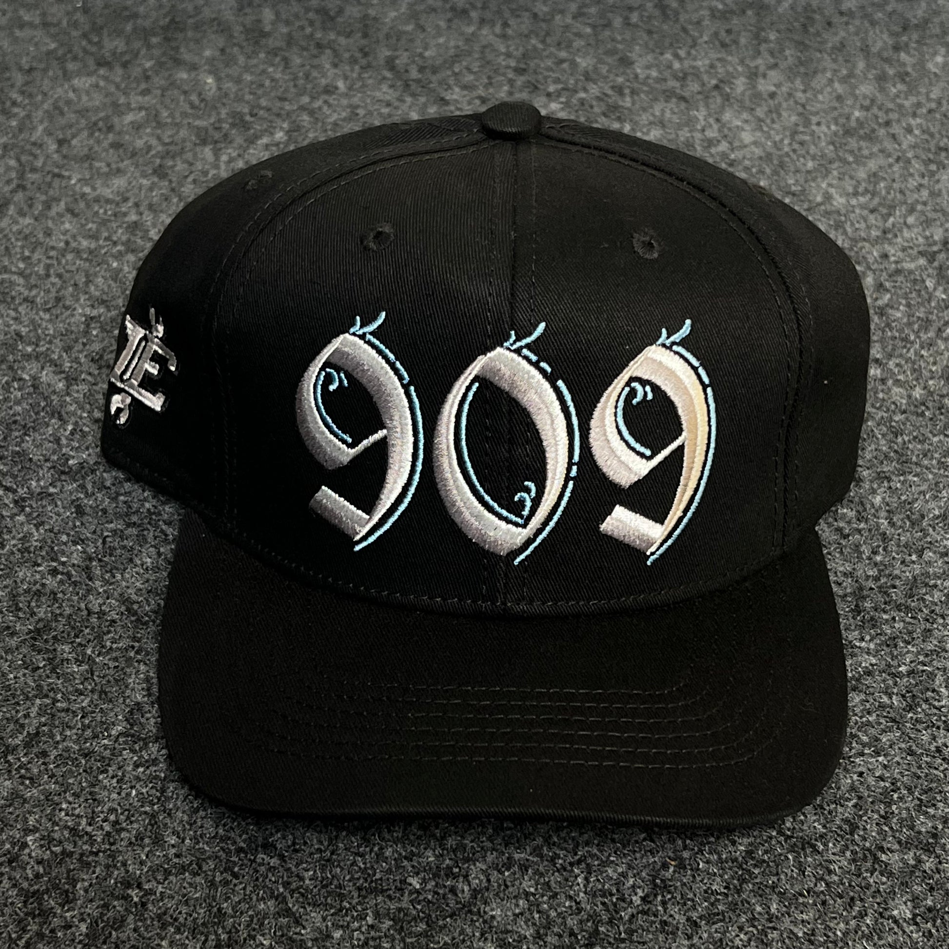 This is a bold and stylish black snapback featuring the number "909" embroidered in a large, sharp, Old English-inspired font on the front. The numbers are filled with a shaded white and light blue gradient, outlined with black for high contrast and a crisp look. A unique graffiti-style emblem is also embroidered on the left side, giving extra streetwear appeal. The entire crown and brim are solid black, making the embroidery the centerpiece.