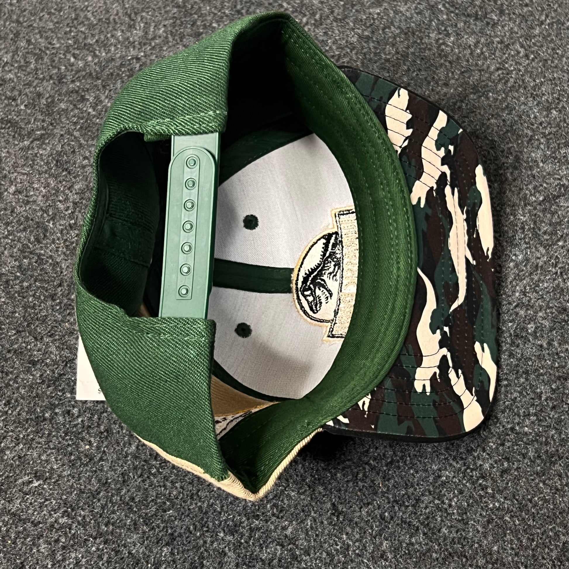 This Jurassic Park baseball cap prominently features the iconic movie logo on the front and a distinctive raptor crossing sign on the side, combining a classic design with thematic details. It's an adjustable snapback cap, often made from acrylic-wool blends, available in various color combinations like the green, beige, and black seen in the image.