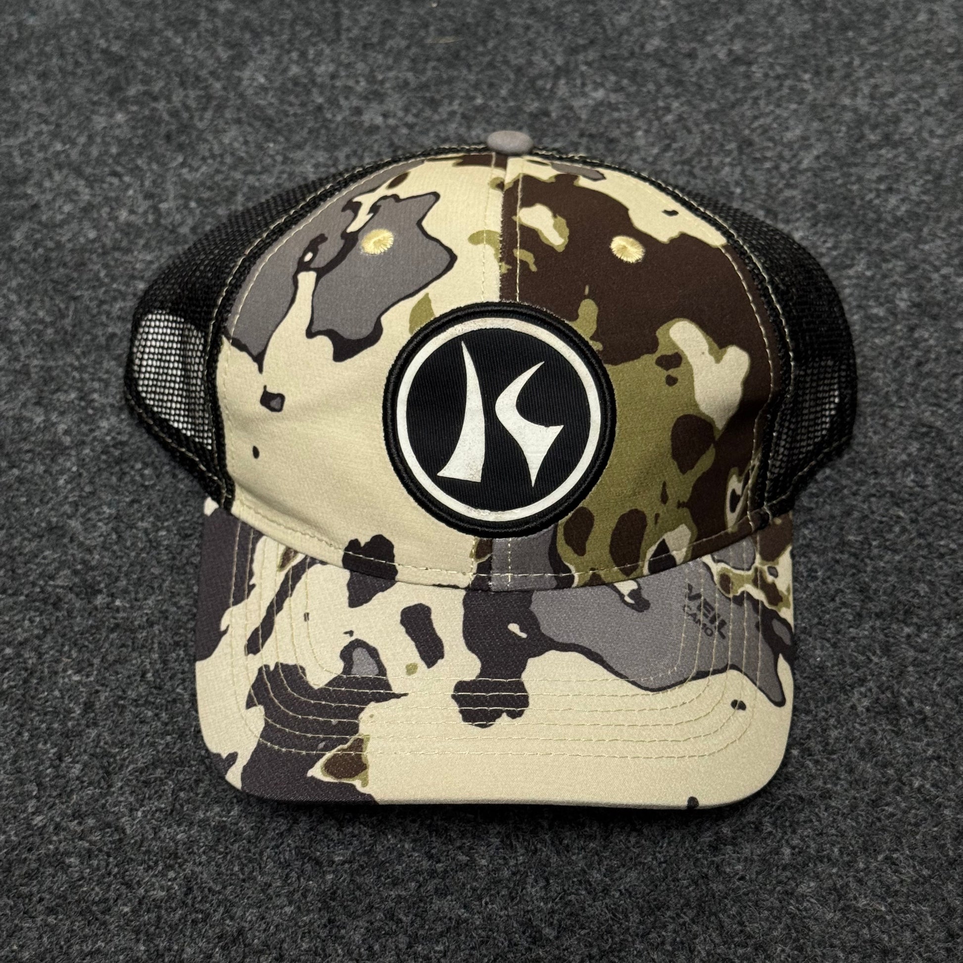 Show your wild side with this modern camo mesh trucker cap, perfect for urban explorers and outdoor enthusiasts. The cap features a rugged multi-tone camouflage print across the structured front and curved brim, finished with a bold round logo patch. A black mesh back ensures you stay cool from city streets to woodland trails.