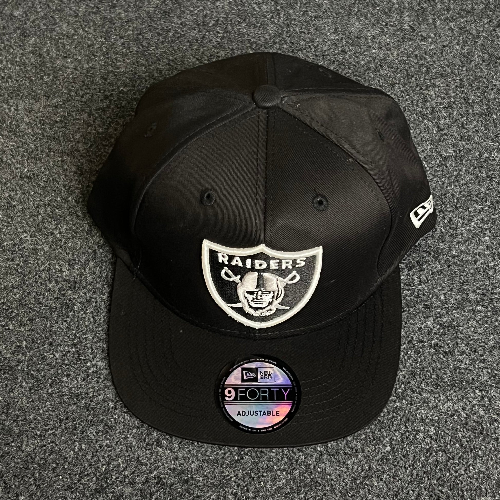 The image shows a Las Vegas Raiders New Era 9FIFTY snapback cap. It features a high-crown, black structured body with a large, classic embroidered Raiders shield logo on the front. The cap has a flat black brim, an adjustable snapback closure, and the New Era logo stitched on the side.