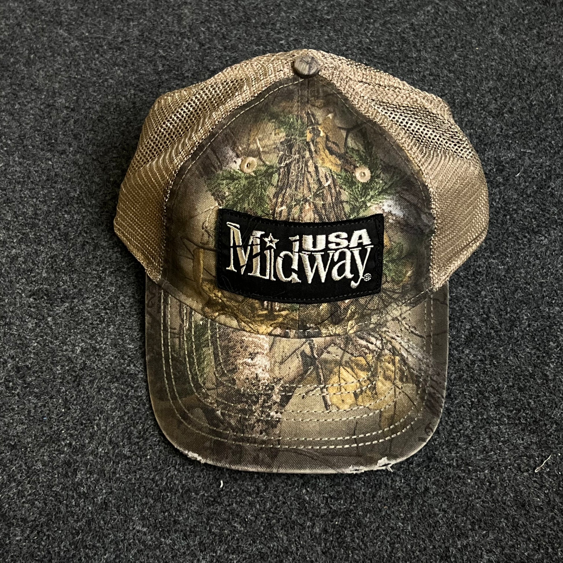 The image shows a distressed, camo-print unstructured trucker cap with rugged tan mesh sides and back. The front panel features a prominent black patch embroidered with "MidwayUSA" in bold white lettering, giving it a workwear and outdoorsy vibe. The frayed edges and faded look make the cap appear broken-in and ready for hunting, fishing, or casual everyday wear.