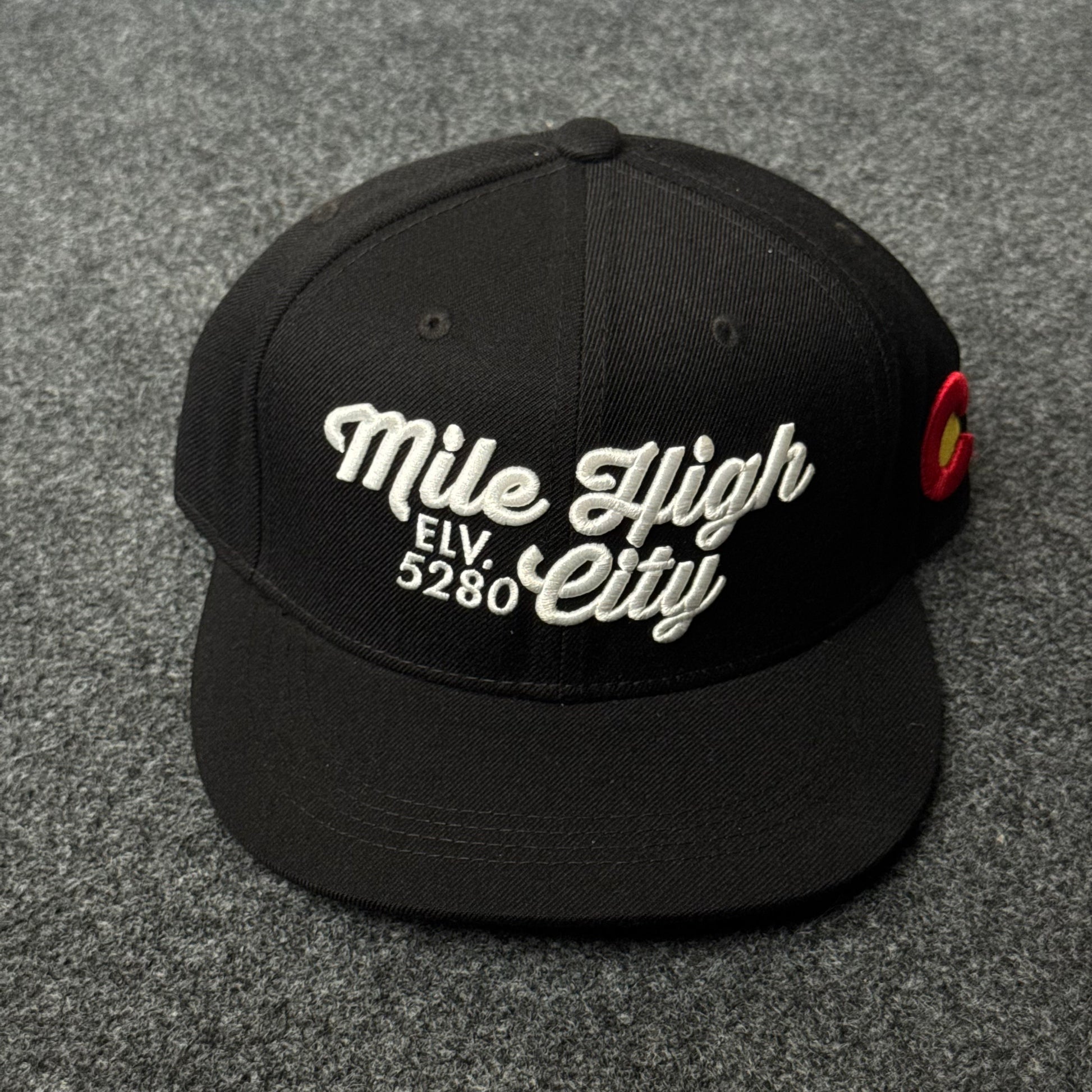 Represent Denver in classic street style with the Mile High City flat bill cap. The structured black crown pops with bold “Mile High City, Elev. 5280” cream embroidery and a flat brim, exuding urban attitude and Rocky Mountain pride. The Colorado flag patch on the side adds a perfect local detail, making this a standout for fans, locals, and anyone who loves high-altitude living.
