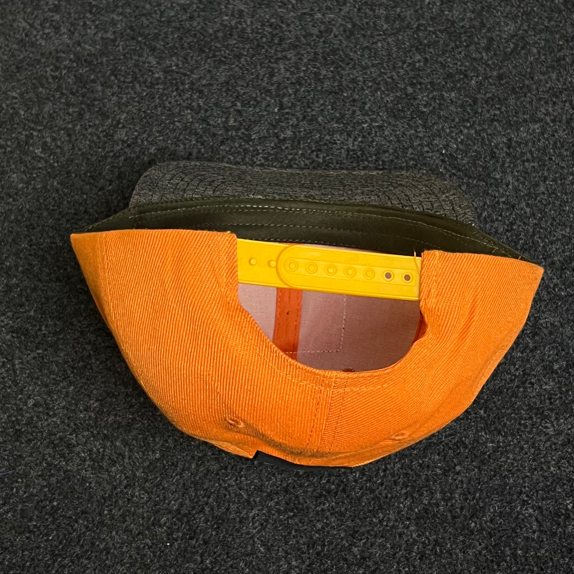 The image shows a modern snapback cap with a bright orange structured crown, a heather gray flat bill, and a large matte black patch on the front. Its bold, two-tone style and oversized patch make it a standout streetwear accessory, perfectly suited for urban fashion and casual confidence.