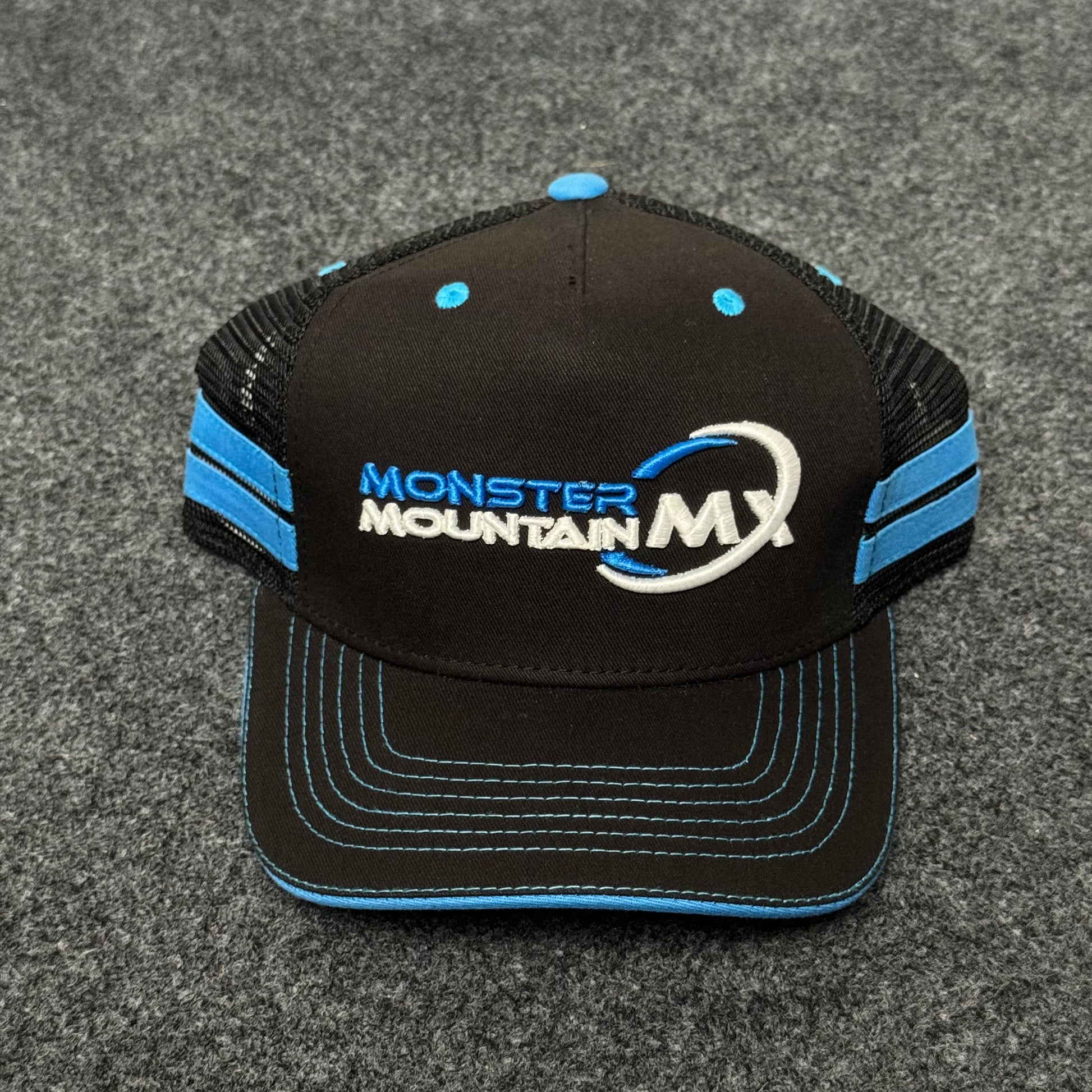 Striking “Monster Mountain MX” logo in white and blue embroidery on black crown