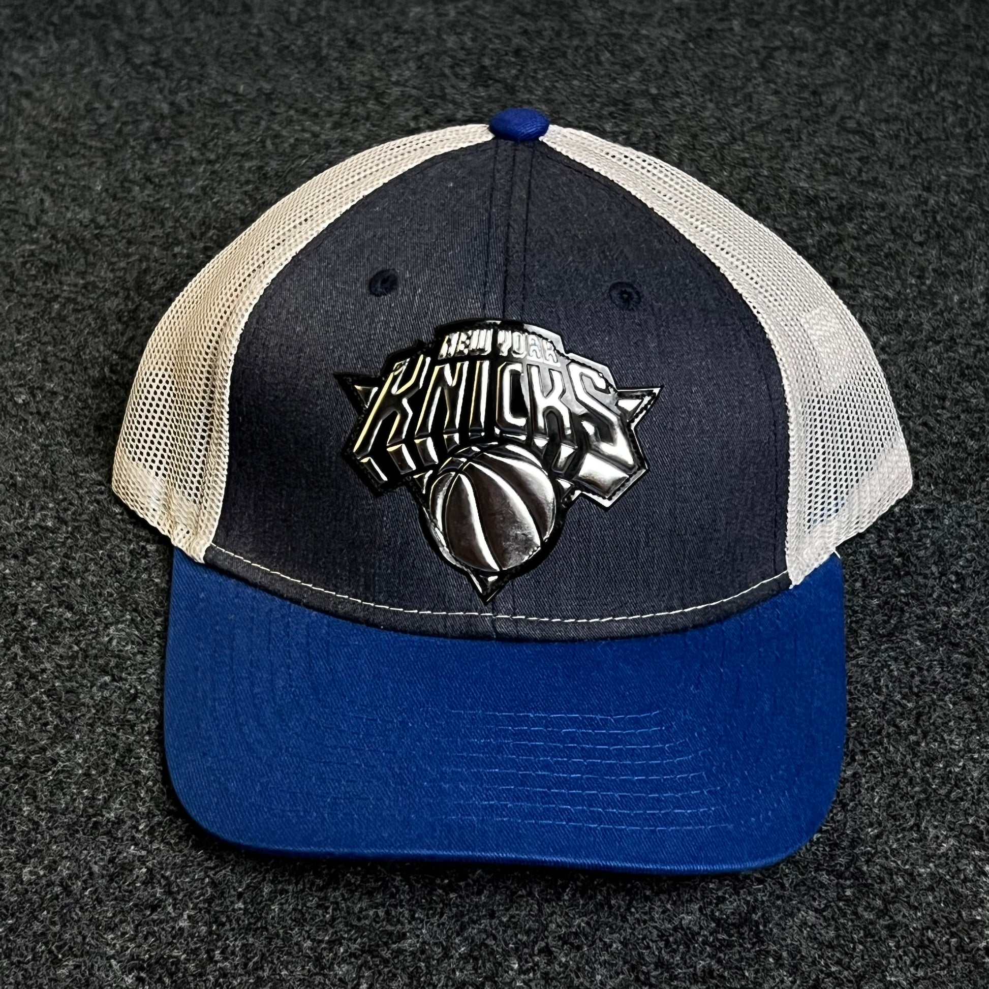 It features a navy structured front, vivid royal blue bill and button, and white mesh back panels for superior ventilation. The front displays a raised metallic and embroidered Knicks logo patch. A classic adjustable snapback closure delivers the right fit for any Knicks fan.