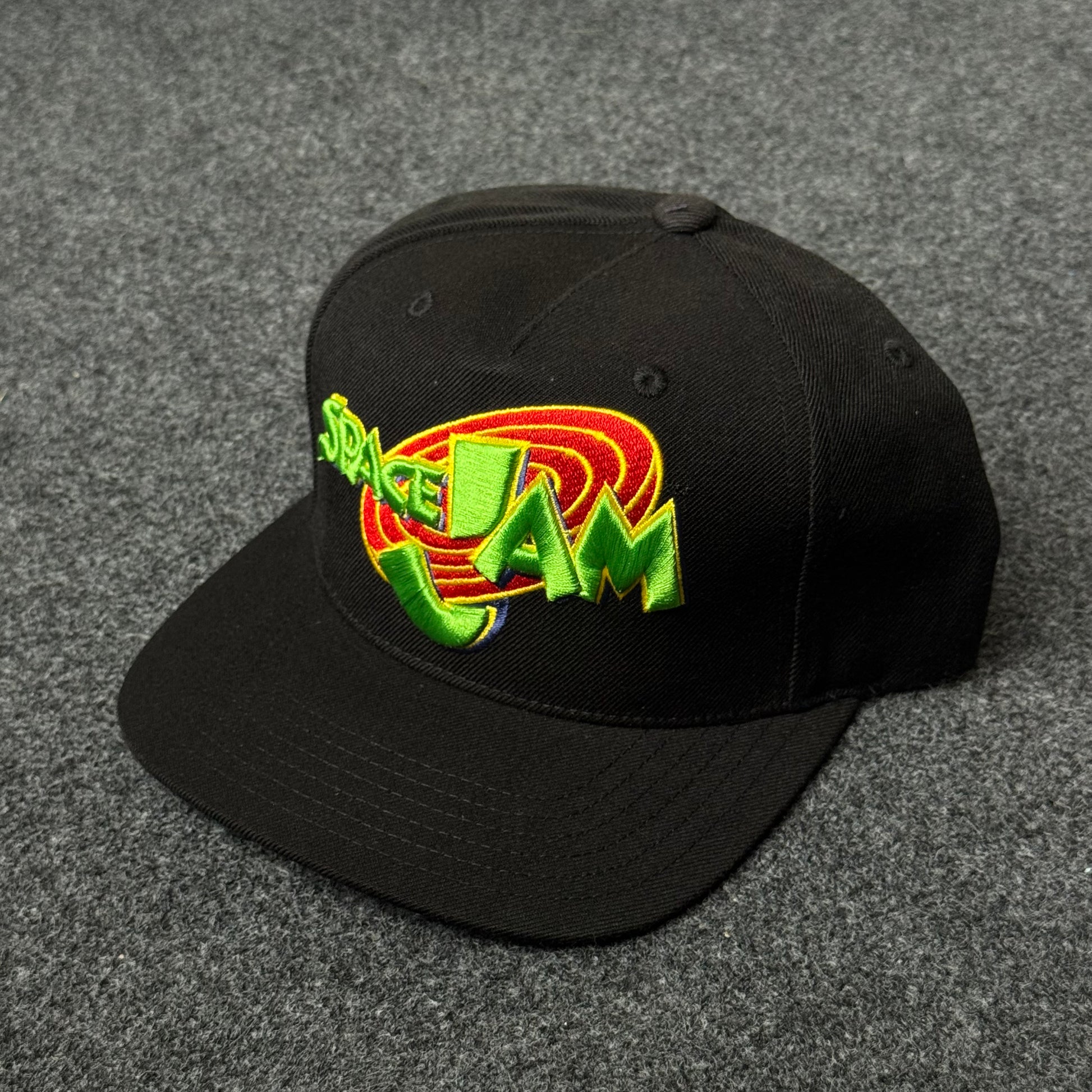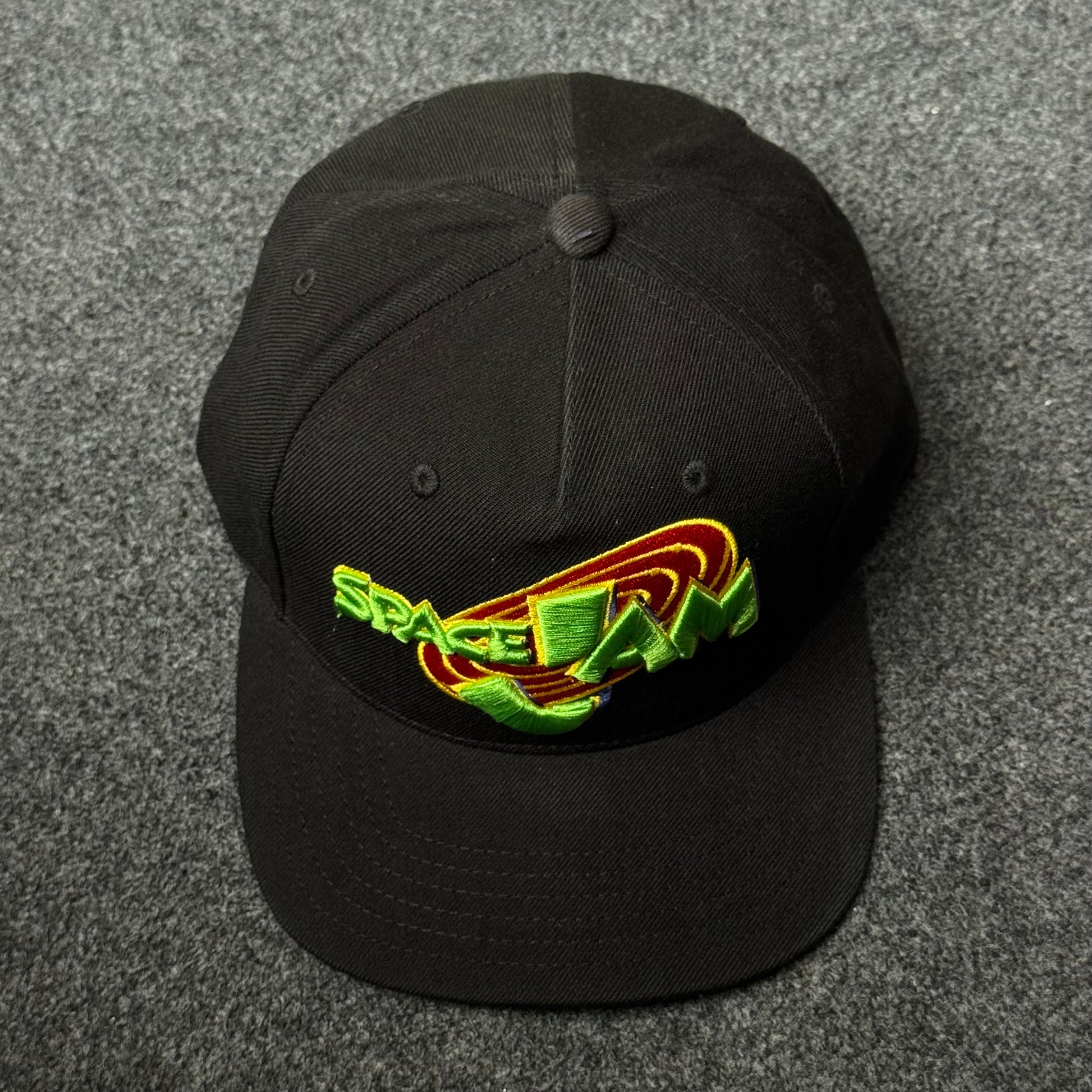 Bold “Space Jam” multicolor embroidered logo on the structured black front