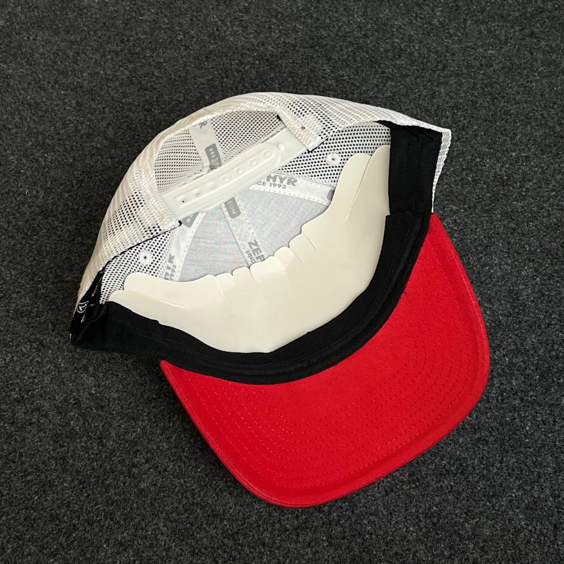 🧢 Black structured front with a crisp red brim