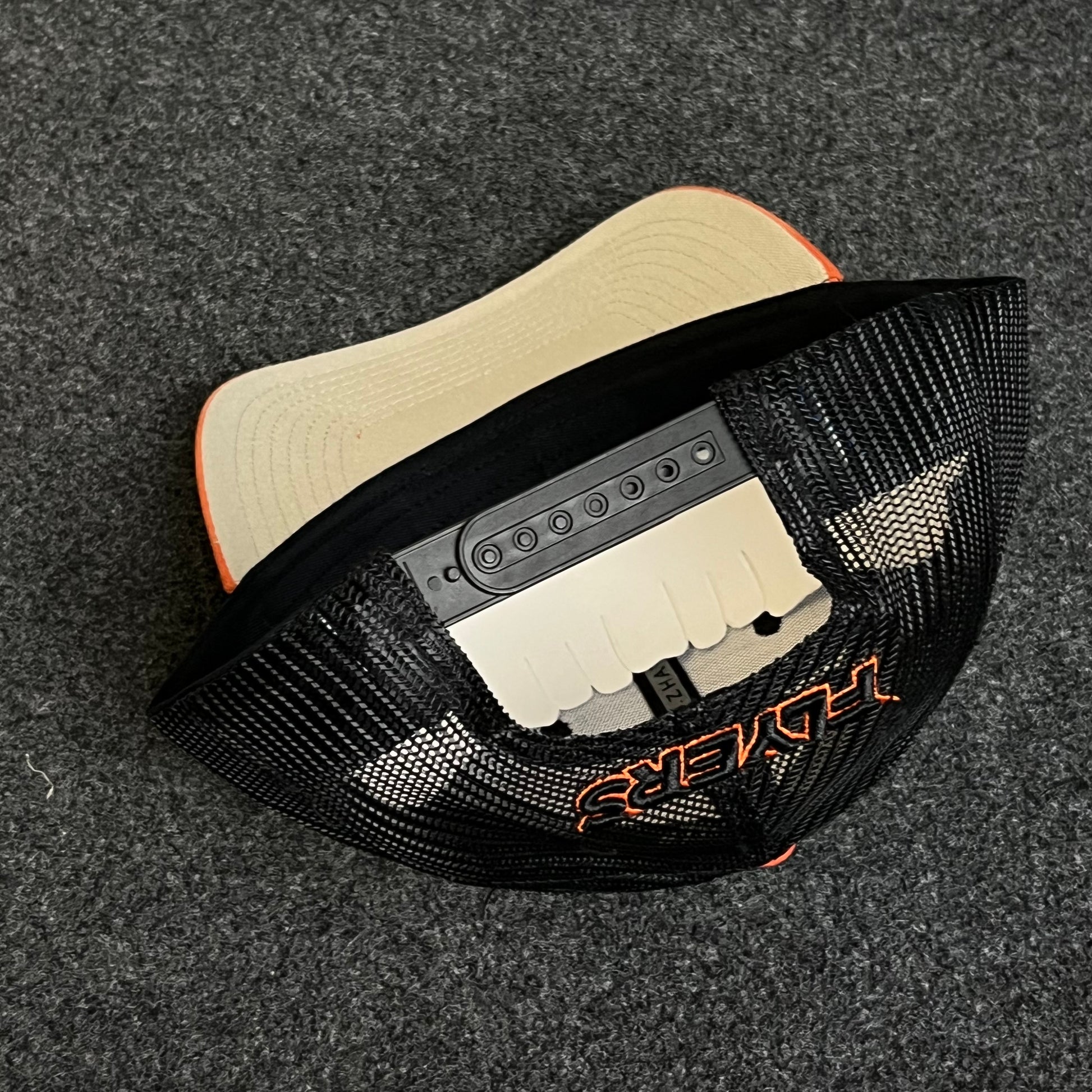 It features a black structured crown and mesh back, bold orange curved bill and top button, and a raised Flyers logo on the front. The underbrim and snapback detail confirm the fan-focused and adjustable construction—ideal for Flyers supporters wanting both comfort and bold team style.