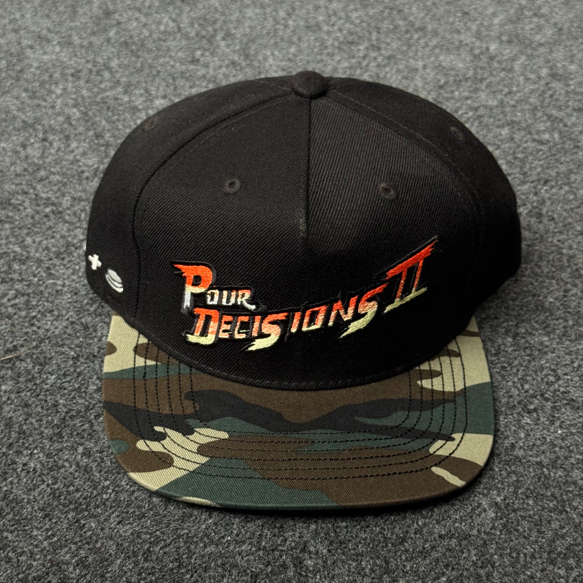 Bold “Pour Decisions II” logo embroidered in red/yellow gradient on structured black panels