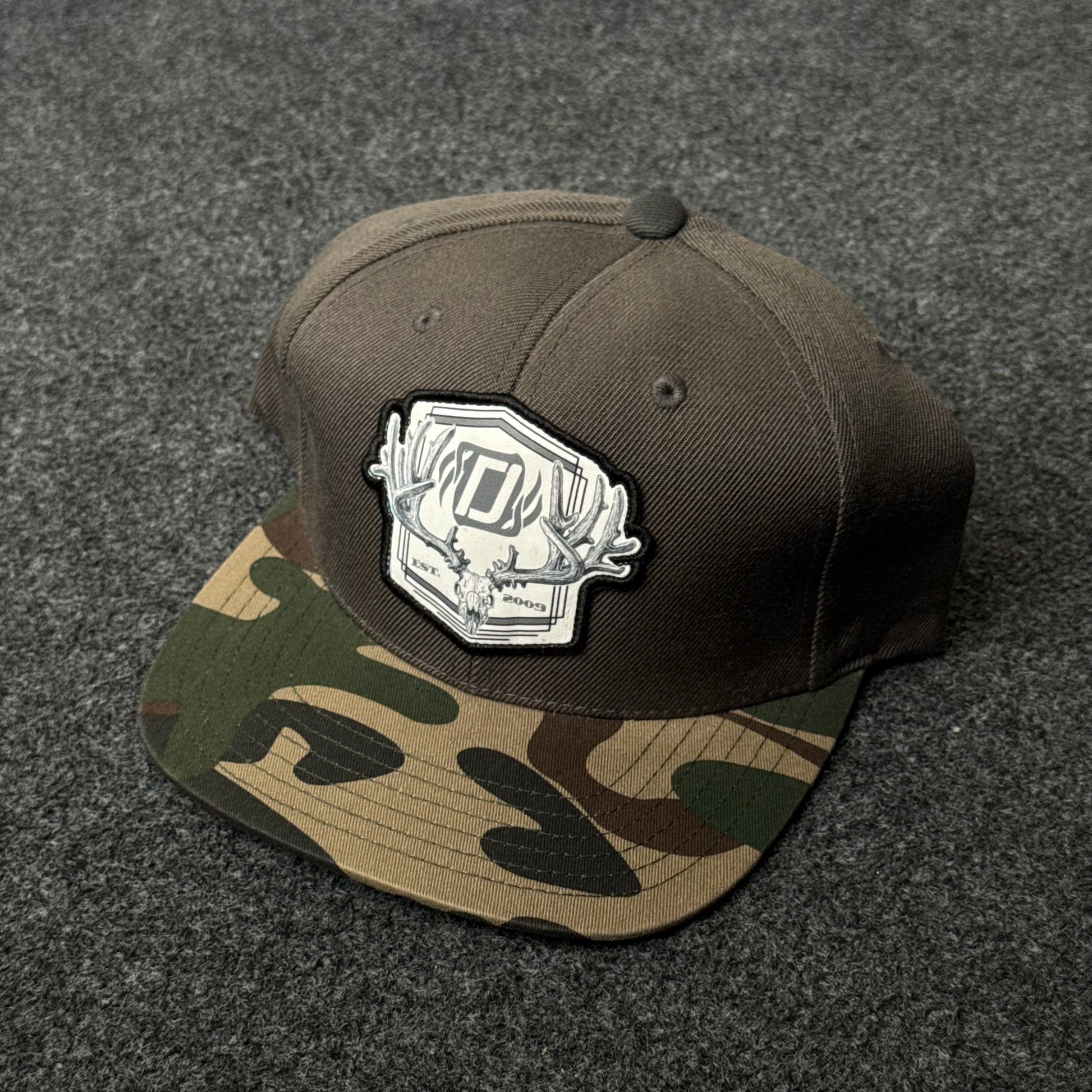 Showcase outdoor grit and modern style with this antler patch camo bill flat bill cap. The structured, earthy brown crown features a bold monochrome antler and logo patch front and center, pairing perfectly with a classic camo-print flat brim. This street-inspired twist on hunting tradition is ideal for outdoor enthusiasts, country fans, and anyone looking to add woodland attitude to their collection.