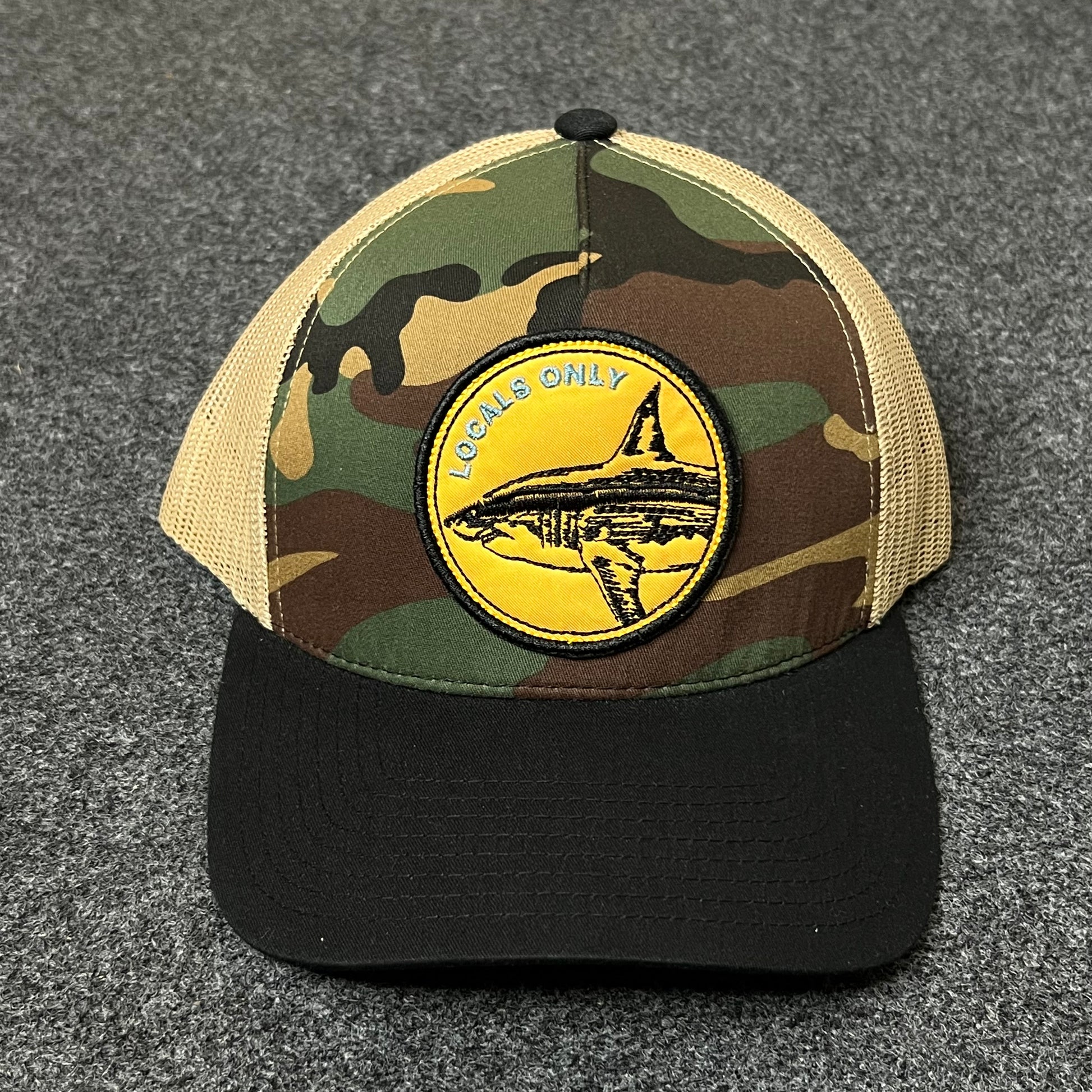 Salty Crew Camo & Black Trucker Hat – Yellow Shark Patch