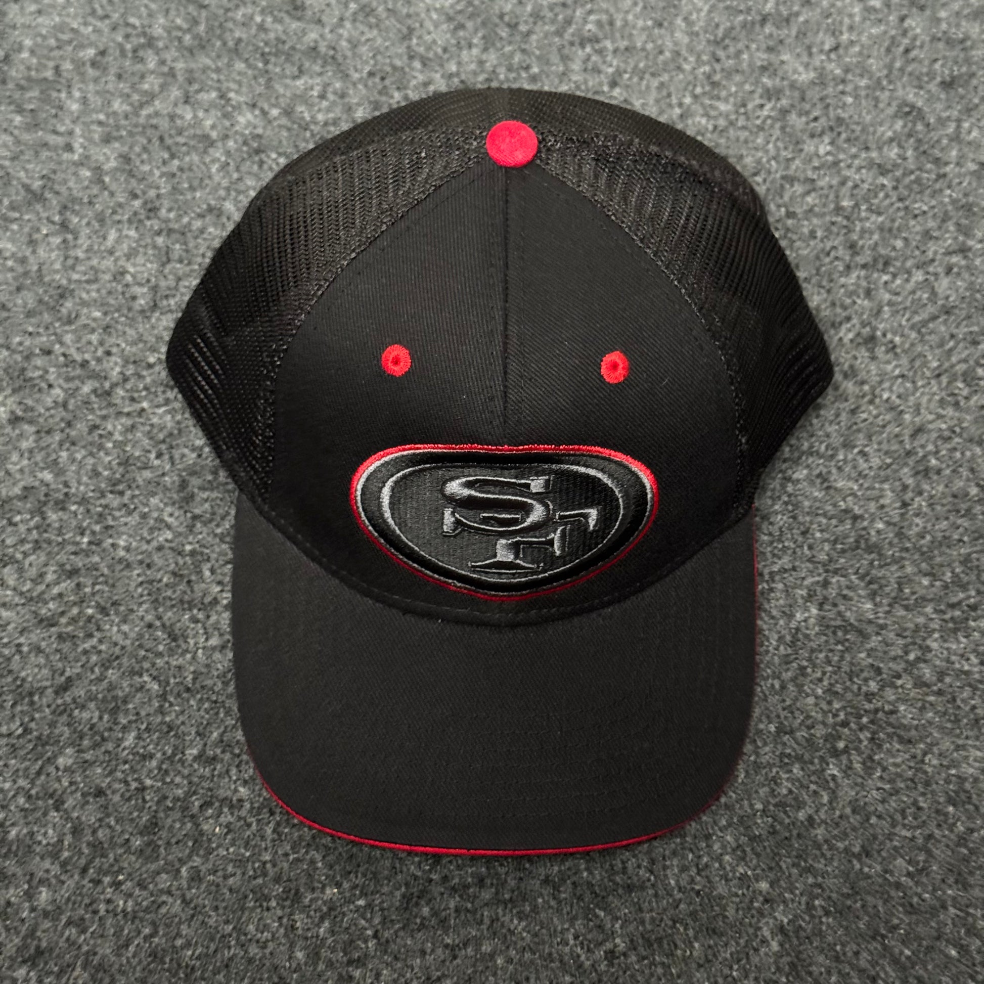 Level up your headwear game with this sleek black SF trucker cap, designed for sports fans, streetwear enthusiasts, and anyone who loves a bold, modern look. The black structured front proudly displays a raised 3D embroidered “SF” logo enclosed in a metallic ring, perfectly complemented by vivid red details and a breathable mesh back.