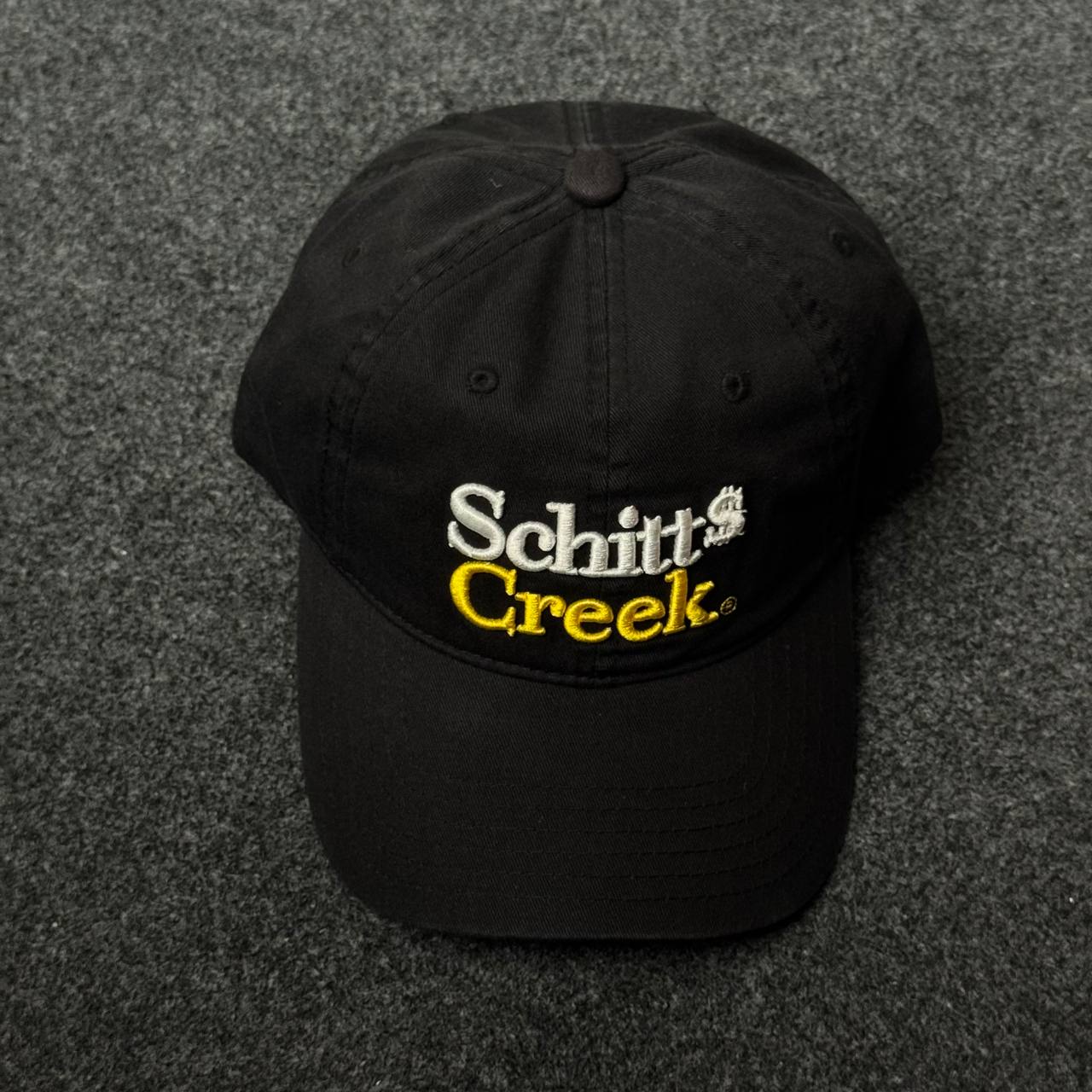 🎬 Bold "Schitt's Creek" embroidery with white and yellow lettering, including a whimsical dollar-sign "S"