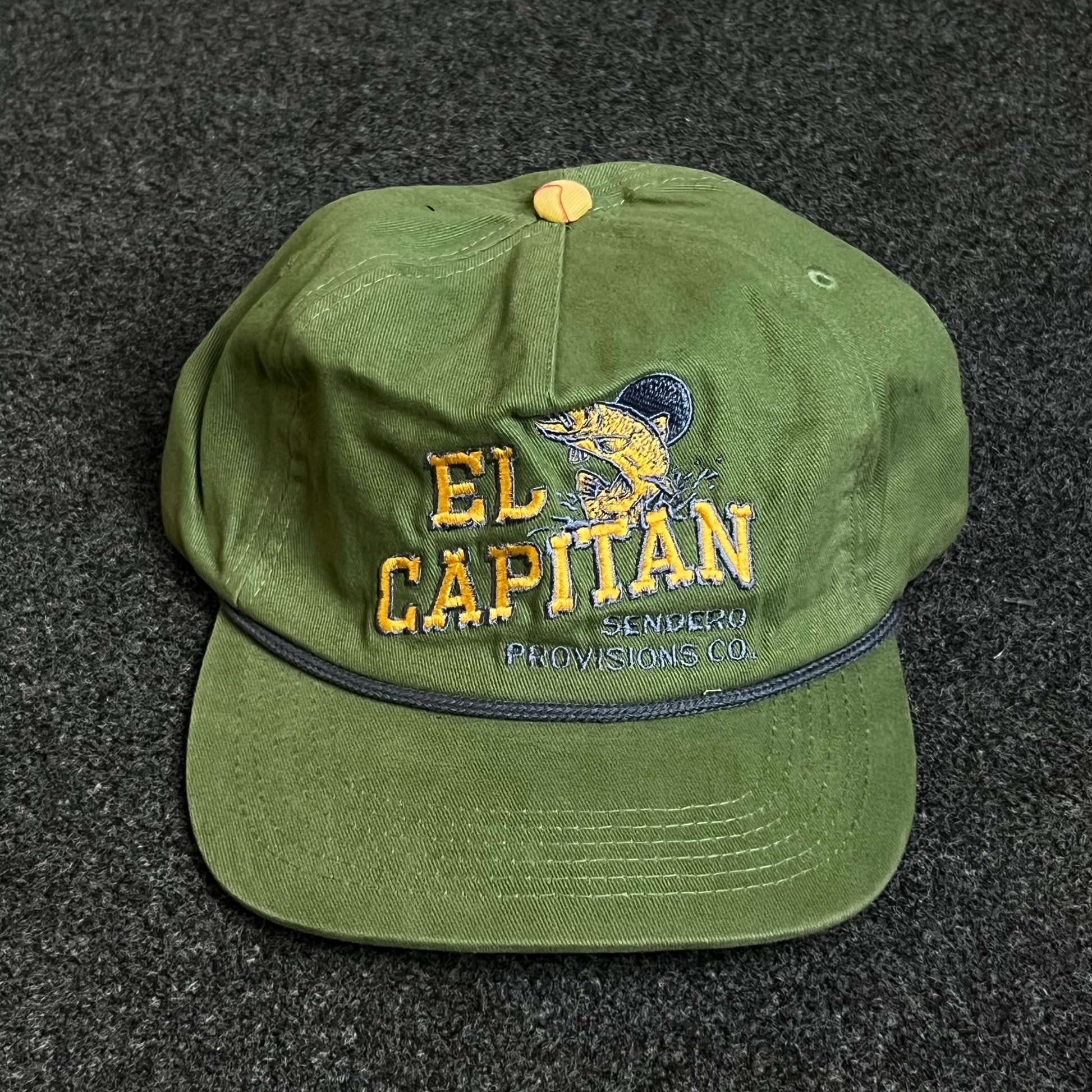 The image features an unstructured cap in deep olive green, adorned with yellow embroidered text reading "EL CAPITAN" and a fish illustration above. The cap has a matching olive green curved brim, a yellow accent button on top, and a dark cord detail above the brim for a subtle vintage outdoor touch. This style offers a relaxed fit and worn-in look ideal for adventure or fishing fans.