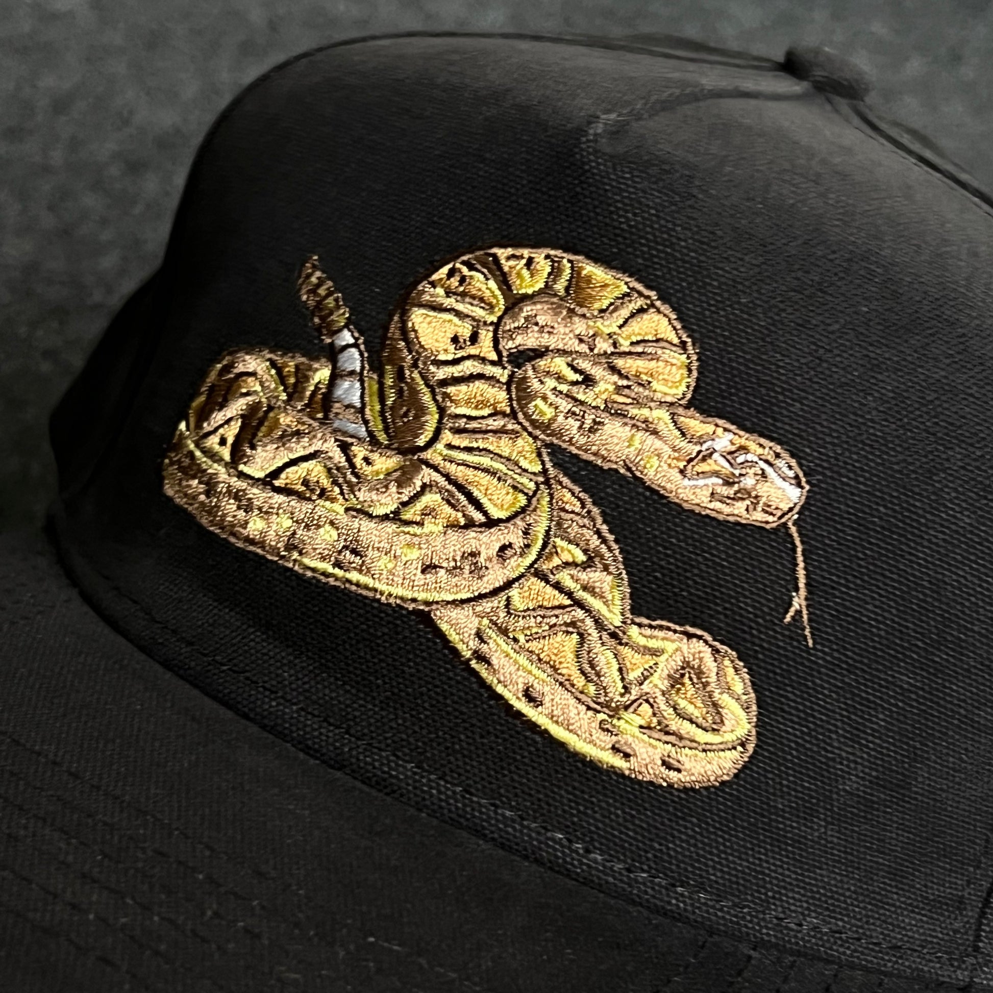 Go bold with this black baseball cap featuring a striking coiled snake graphic up front and a side hit with “DON’T TREAD ON ME” text. A classic curved brim and structured crown make it an easy, statement-ready wear.