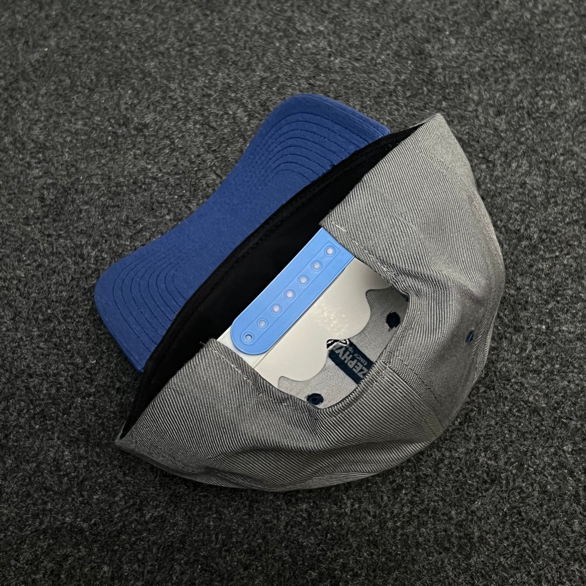 🧢 Gray six-panel structured crown with navy blue brim and top button