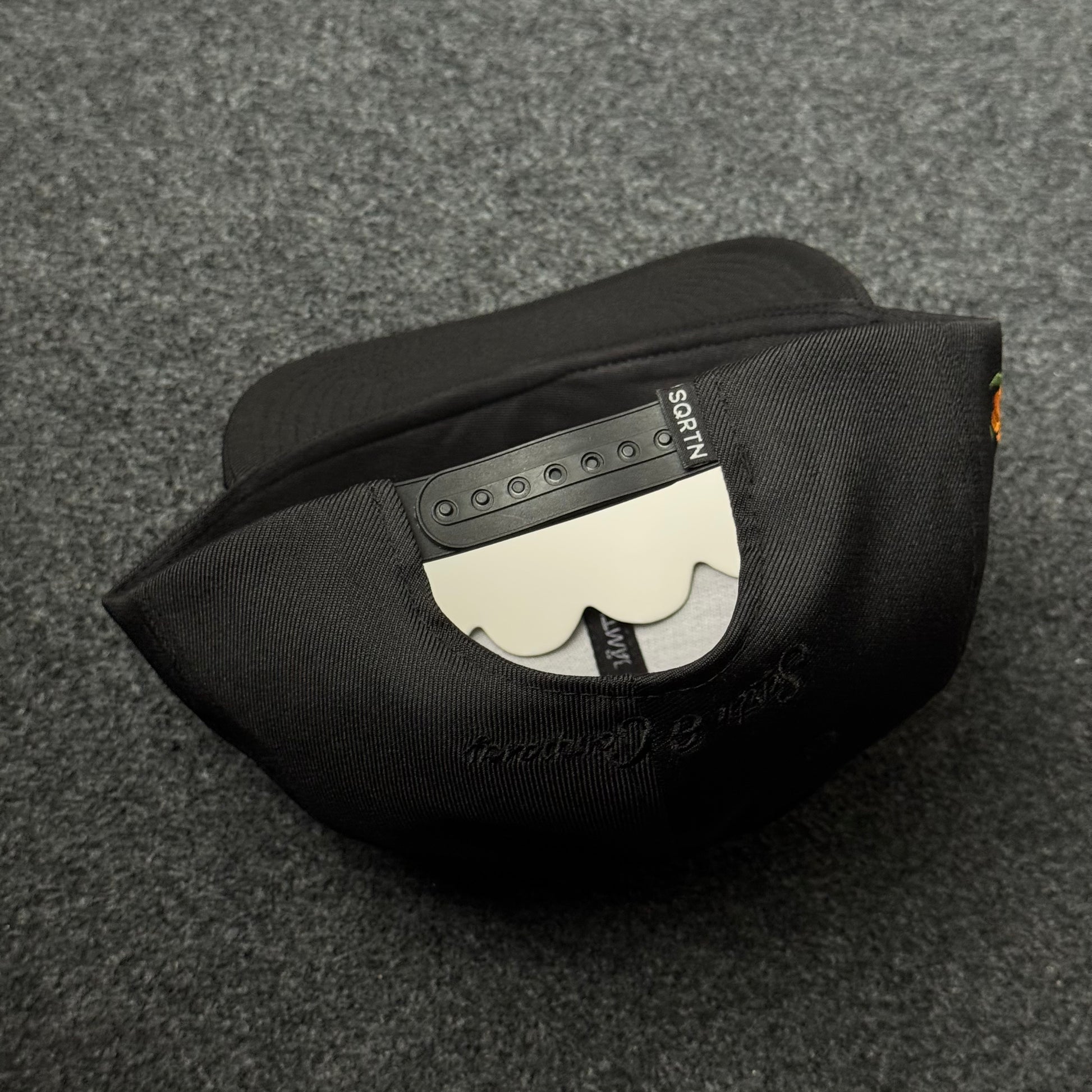 Detailed orange and yellow flower embroidery on the front and side of structured black panels
