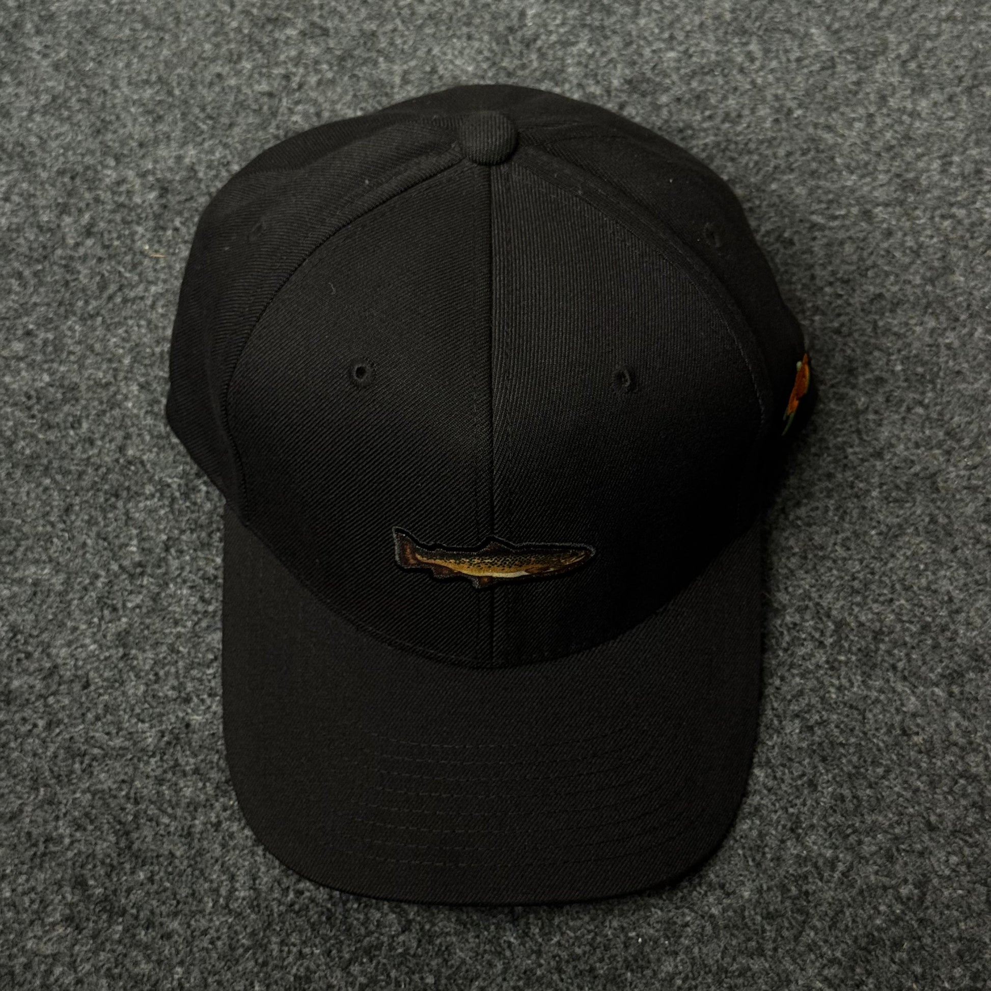This cap features an understated, outdoorsy design perfect for fishing or nature enthusiasts. It is solid black, with a structured six-panel crown, curved bill, and matching black top button. Centered on the front is a detailed embroidered fish patch—possibly a trout or salmon—in naturalistic colors, delivering a subtle yet distinctive focal point. An orange rose is also embroidered on the left side of the cap, adding a unique touch of color and personality.