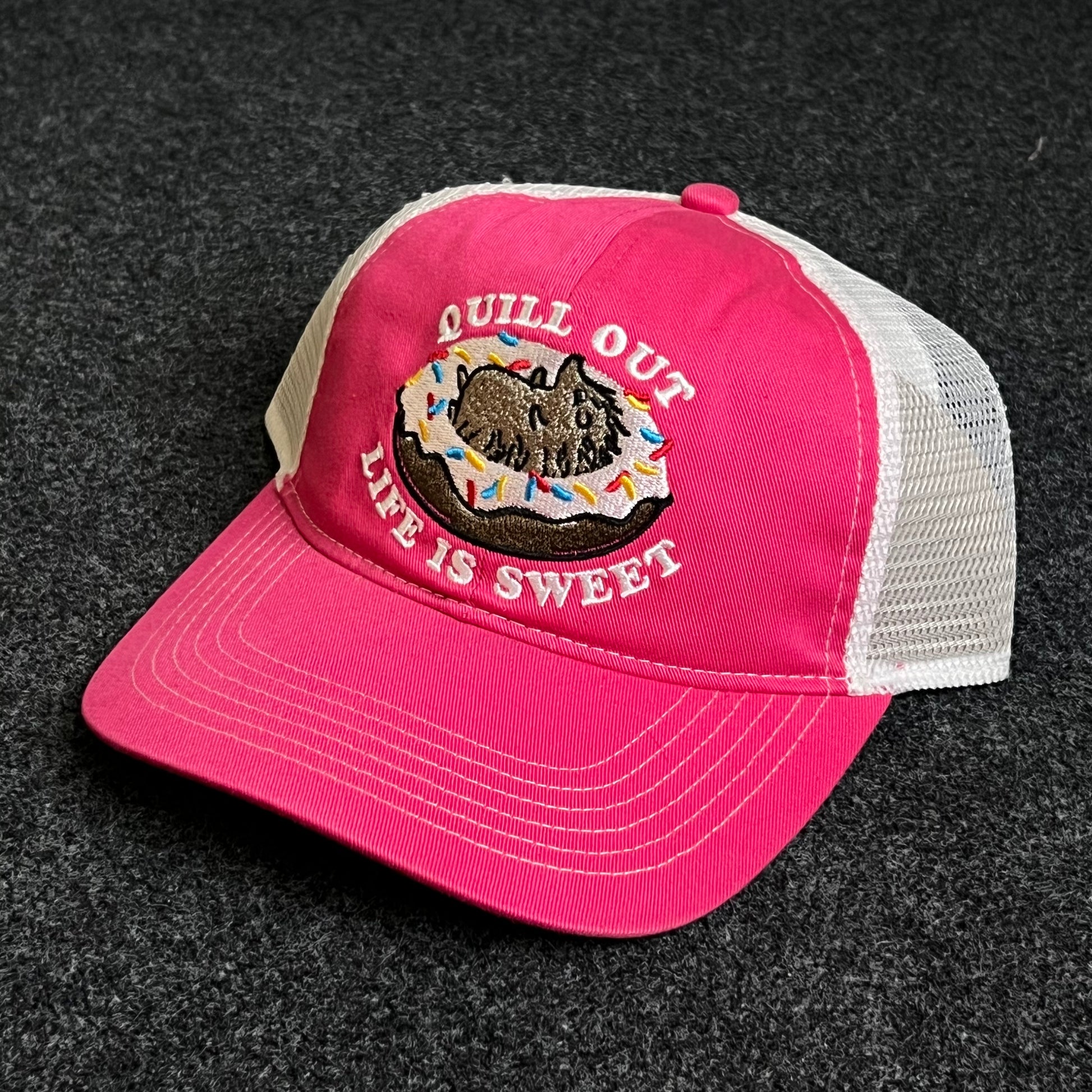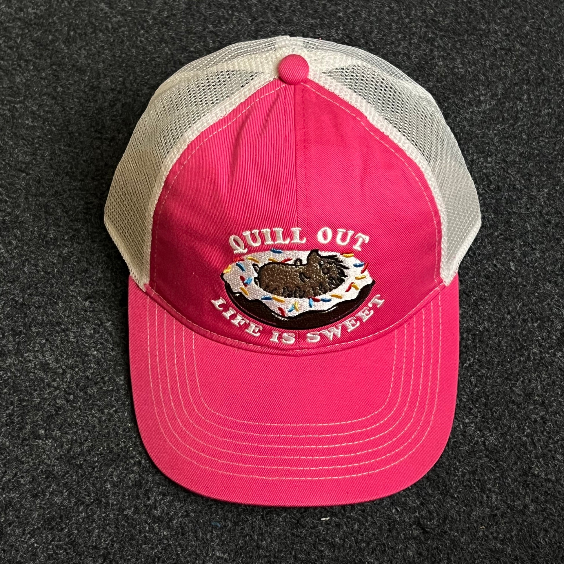 The image shows a bright pink and white mesh trucker cap with playful embroidery of a hedgehog on a donut, surrounded by the whimsical text “QUILL OUT LIFE IS SWEET.” This youth-sized cap is perfect for kids who love animals, positive messages, and unique, colorful accessories.